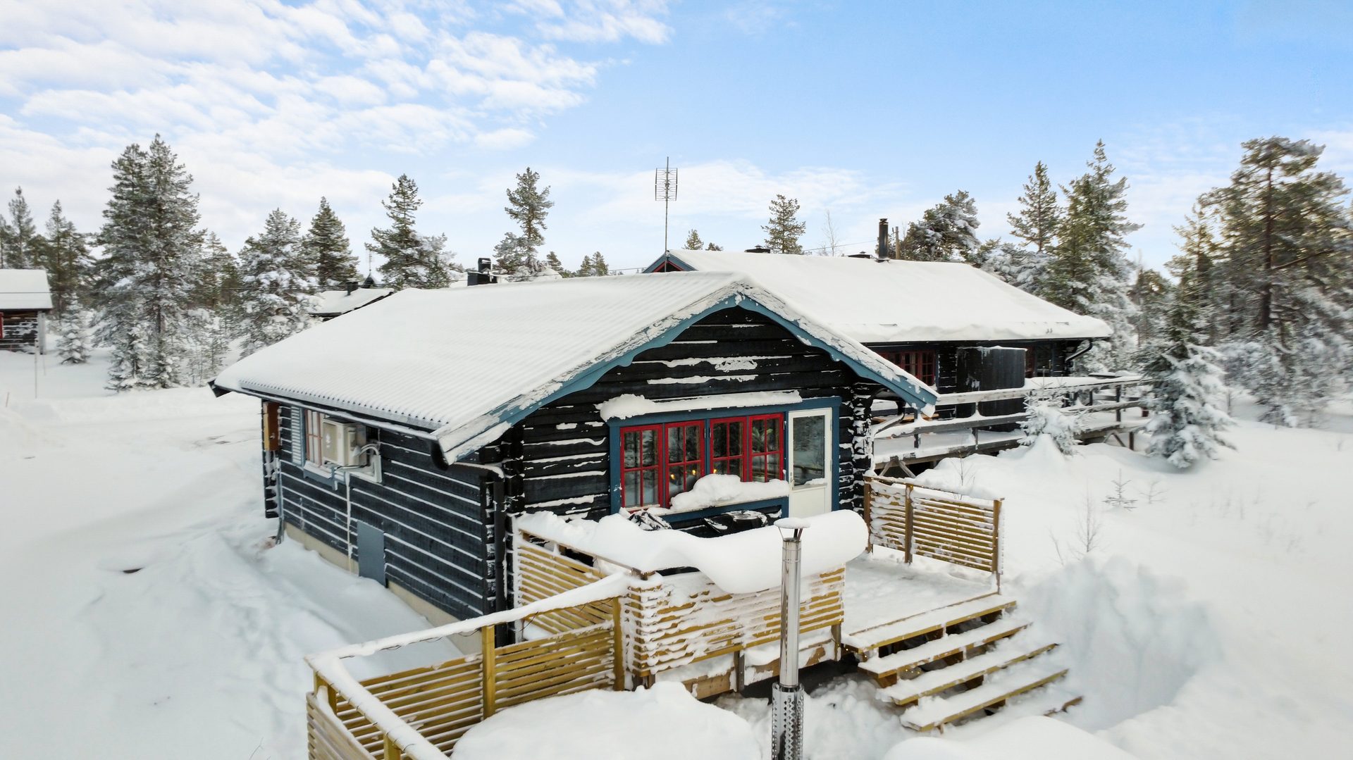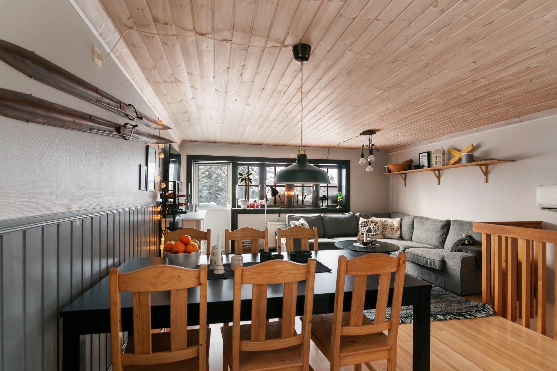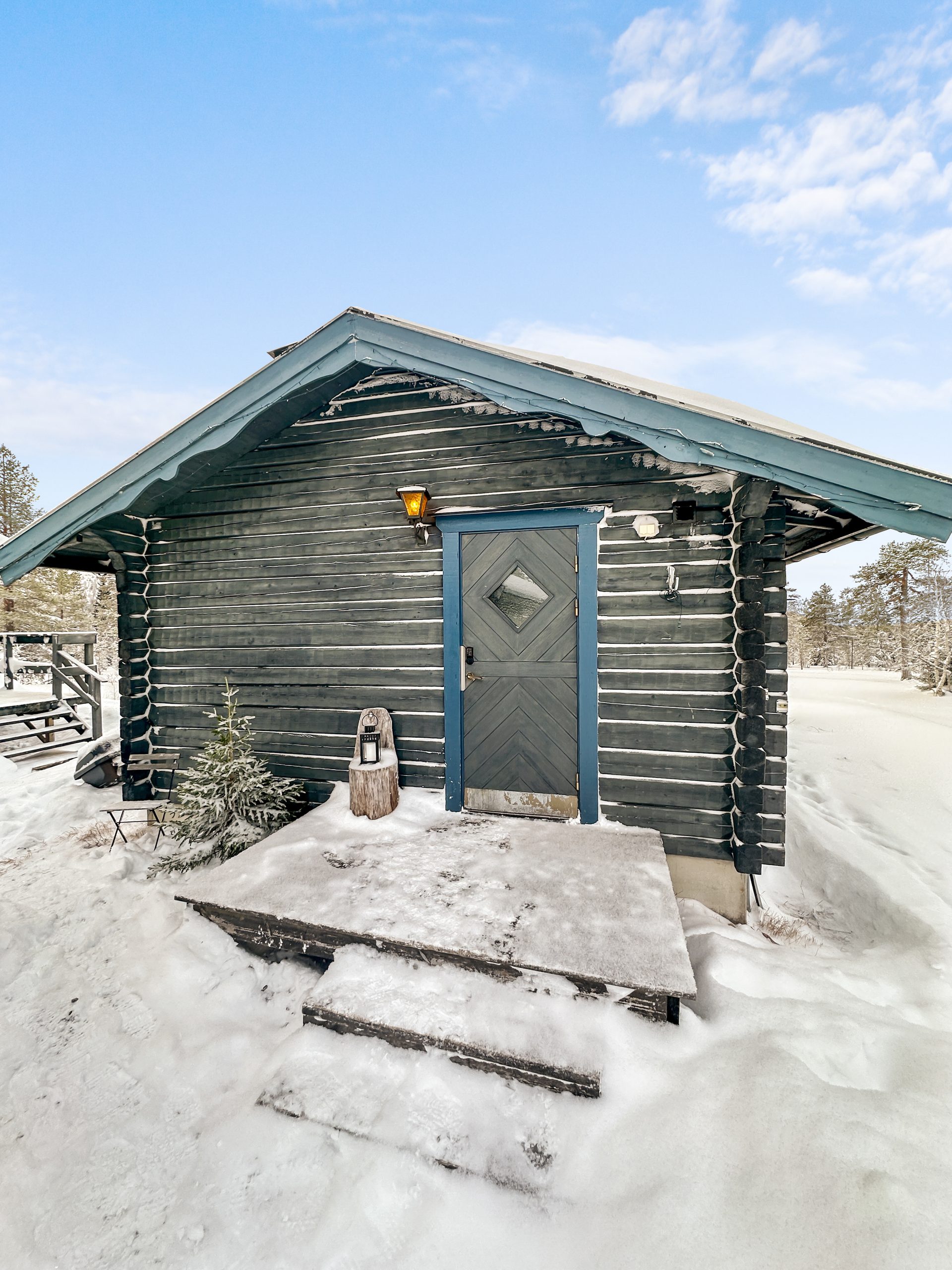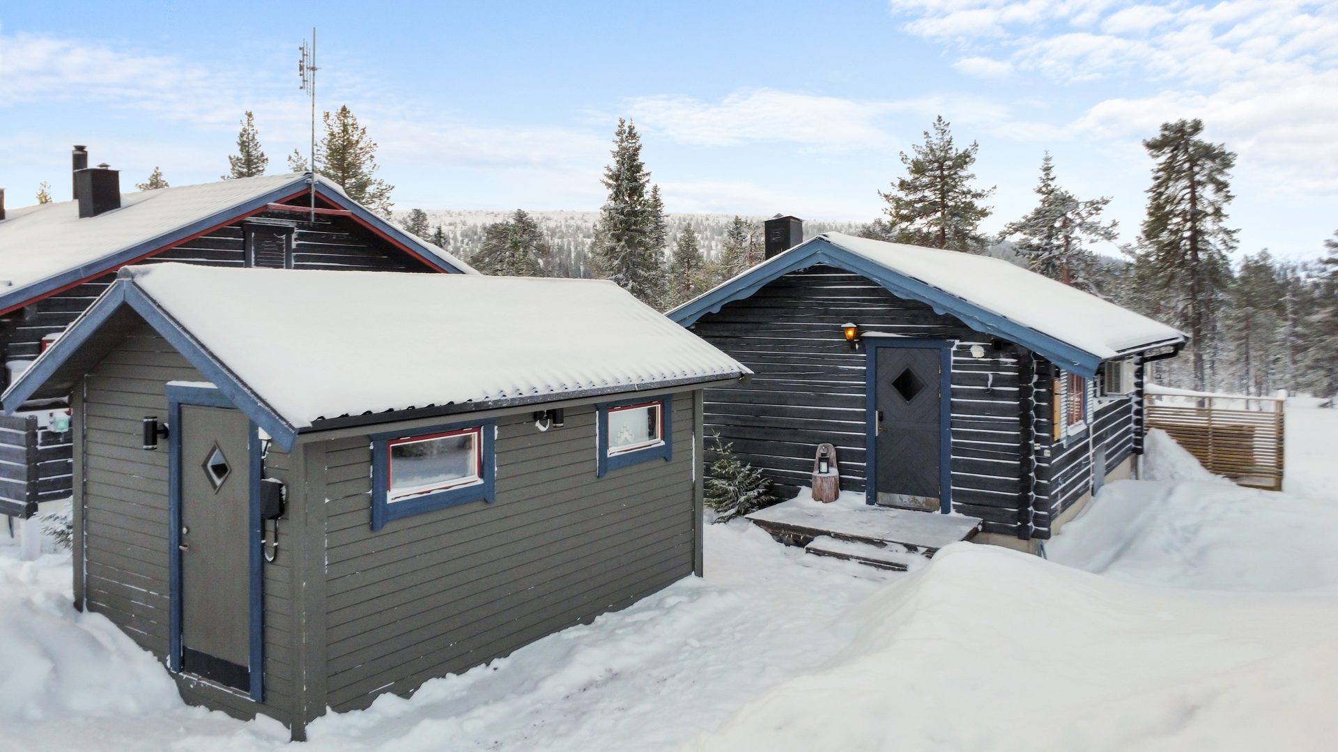 Gäststugan invid entrén är praktisk med egen ingång till sovutrymmet. Skidboden har dörr ut mot vägen.
