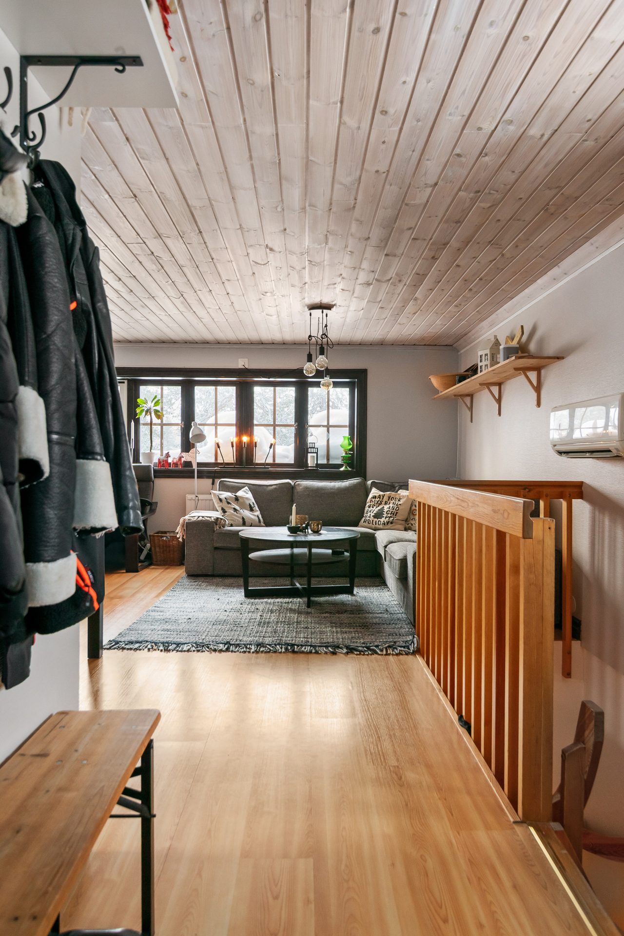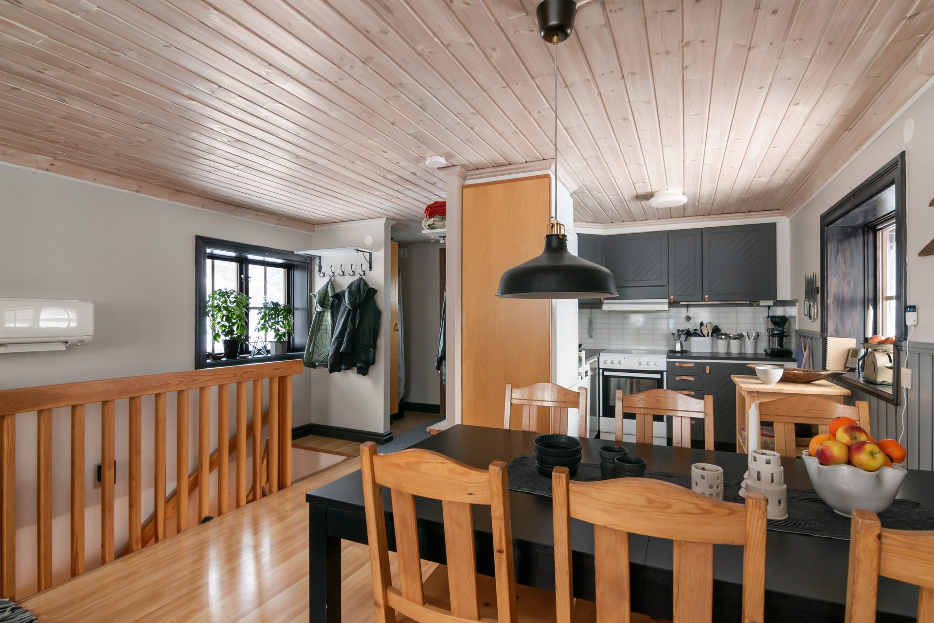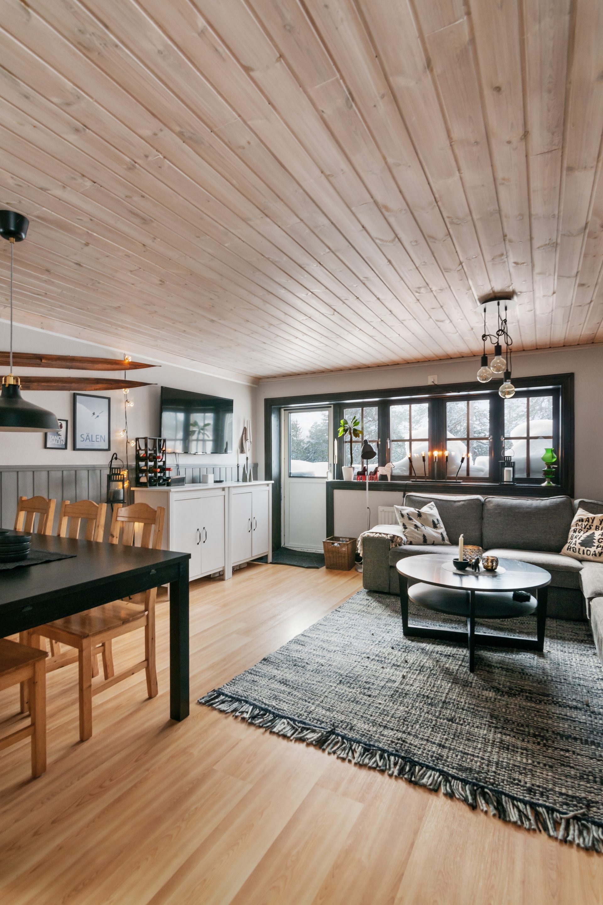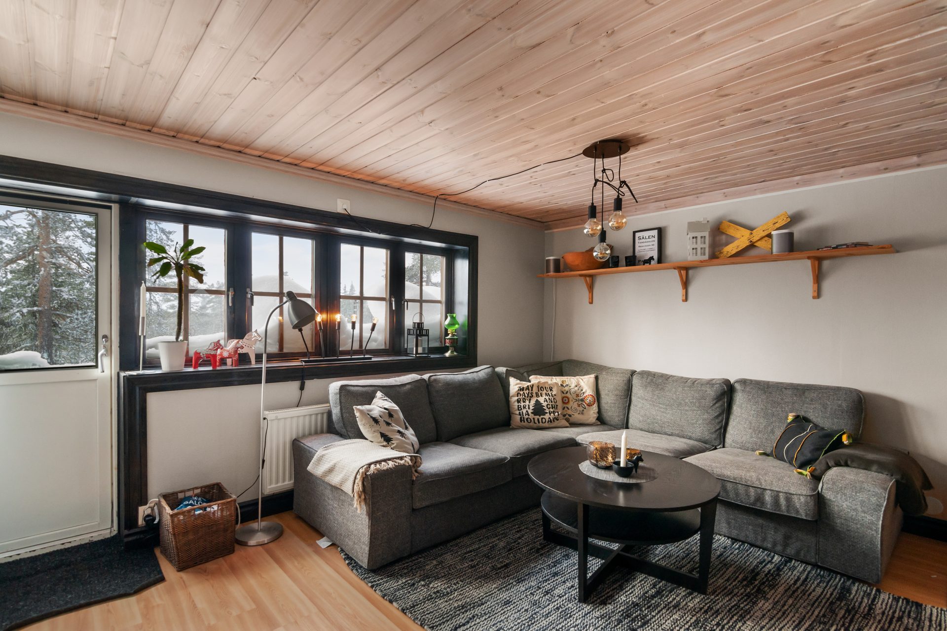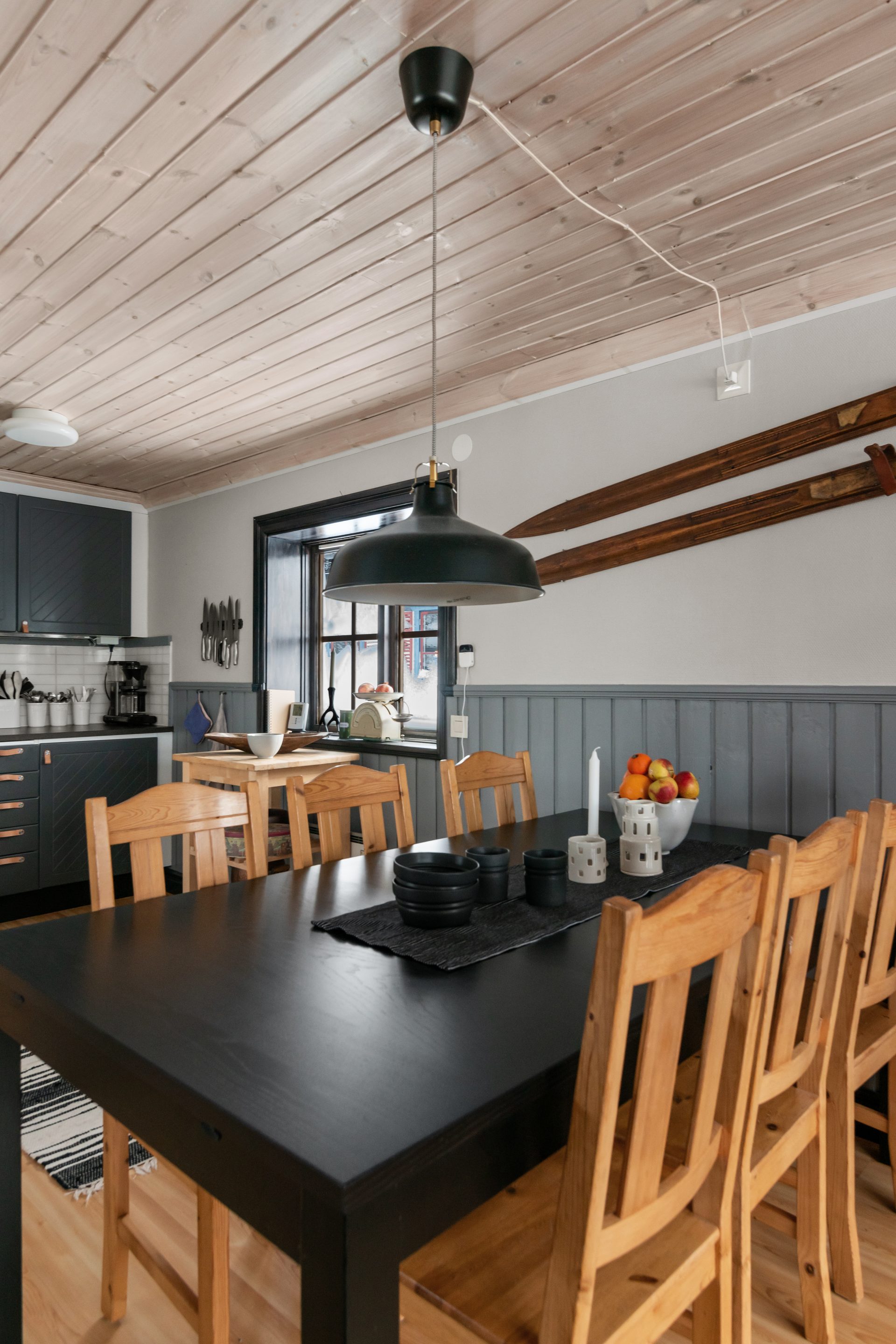 Gäststugan invid entrén är praktisk med egen ingång till sovutrymmet. Skidboden har dörr ut mot vägen.