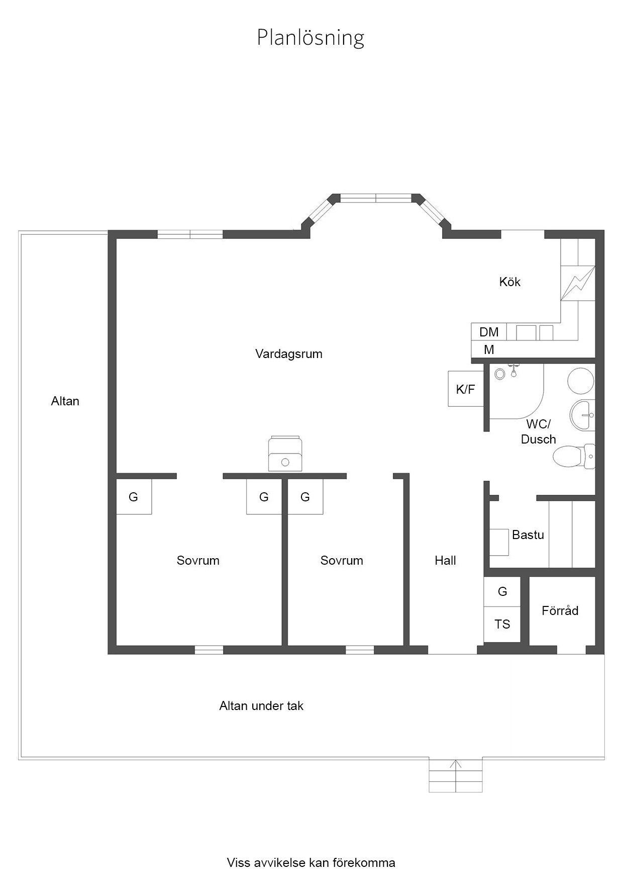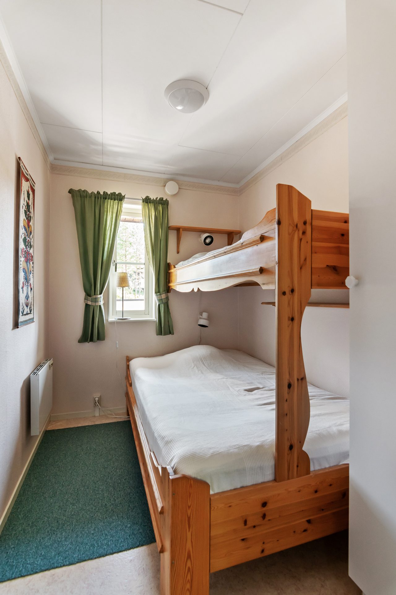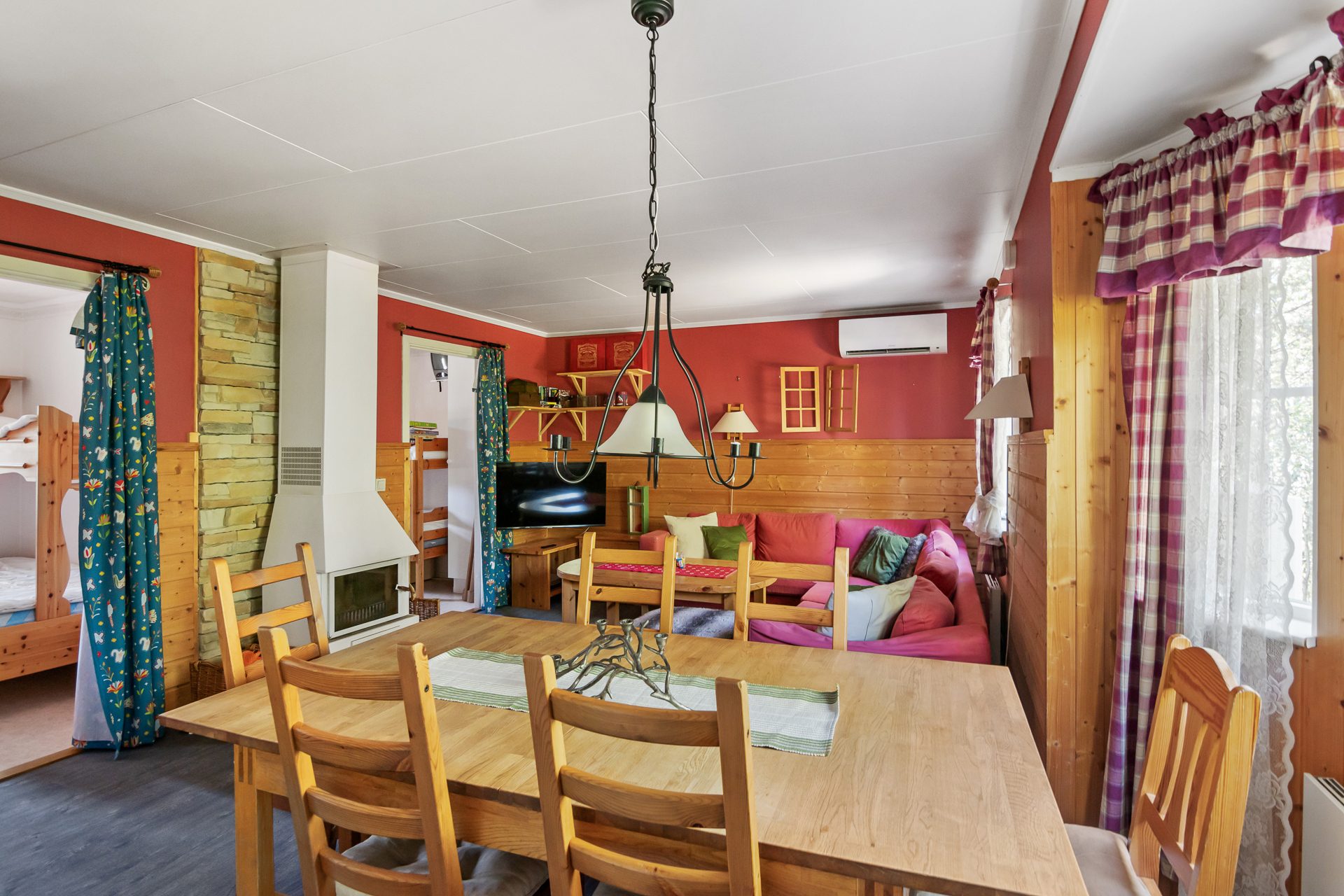 - Allmän beskrivning: Hall med avhängning och garderober. Hallen för dig vidare in i huset och öppnar upp mot vardagsrummet. Vardagsrummet är ljust med ett fint burspråk och öppen planlösning mot köket. Här finns även matplats för 6-8 personer samt utgång till en altan. Köket är välordnat med spis, fläkt, diskmaskin och kyl/frys samt god förvaring. Från vardagsrummet når du även de två sovrummen där ett är större med två våningssängar som ger 4 bäddar och ett mindre sovrum med en familjevåningssäng som ger 2+1 bäddar. Badrum med bastu ligger till höger från hallen och är utrustat med dusch, handfat, wc, tvättmaskin och varmvattenberedare samt en egen bastu. En fin altan i tre väderstreck som sträcker sig från entrésidan hela vägen runt till baksidan där du får plats med en sittgrupp för att njuta av solen när vädret tillåter.