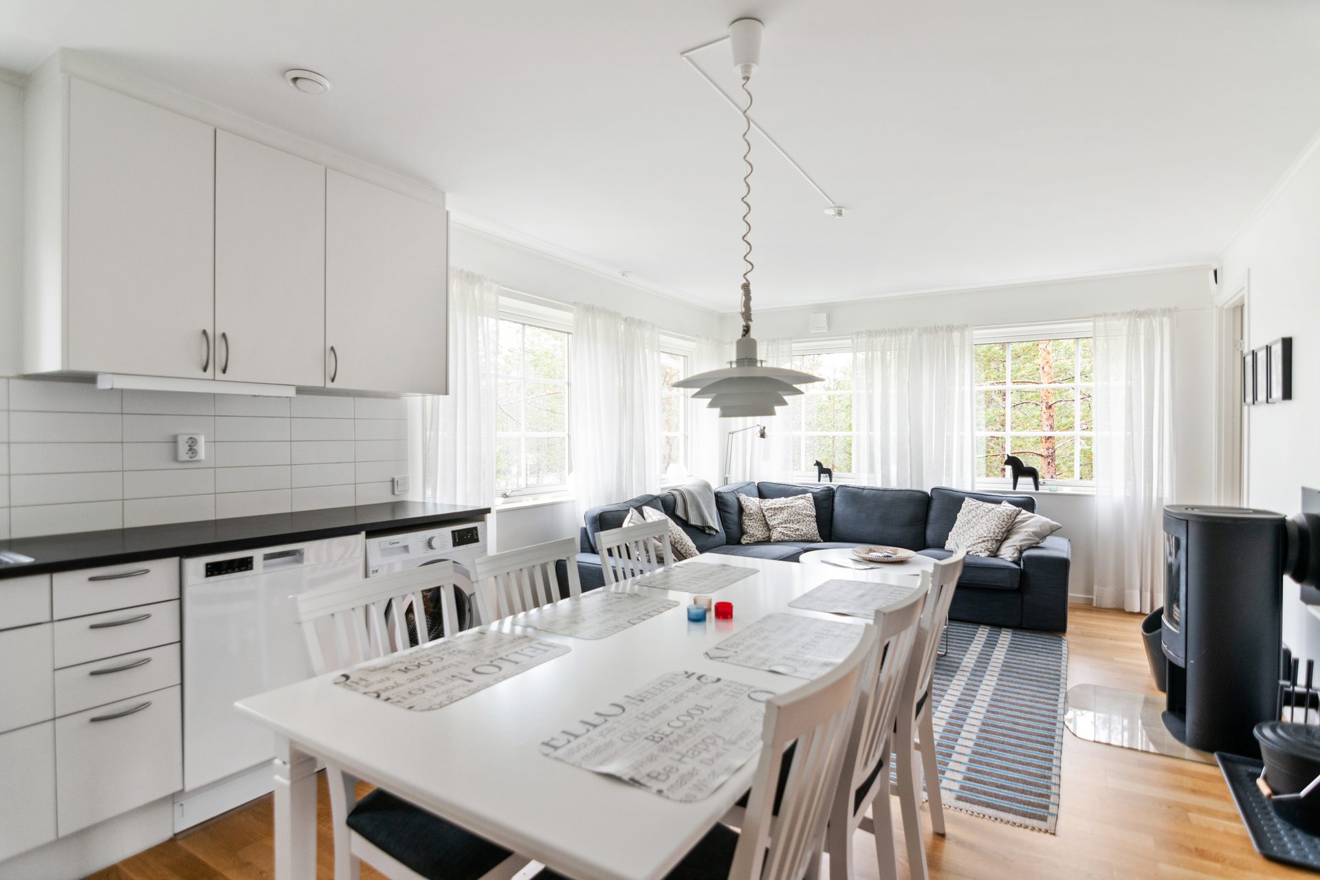 - Allmän beskrivning: Rymlig hall med avhängningsmöjlighet och klinkergolv. Hallen för dig vidare in mot köket som har full maskinell utrustning och matplats för 8-10 personer. Öppen planlösning mellan vardagsrummet och köket. Vardagsrummet har generösa fönsterpartier i två väderstreck, vedeldad kamin och ingång till ett av sovrummen. Vidare finns det två sovrum till som ligger i anslutning till hallen. Ett av sovrummen är ett masterbedroom med dubbelsäng. Samtliga sovrum har garderober. Det finns två badrum med dusch och wc. Det stora badrummet har även en vidbyggd bastu.
