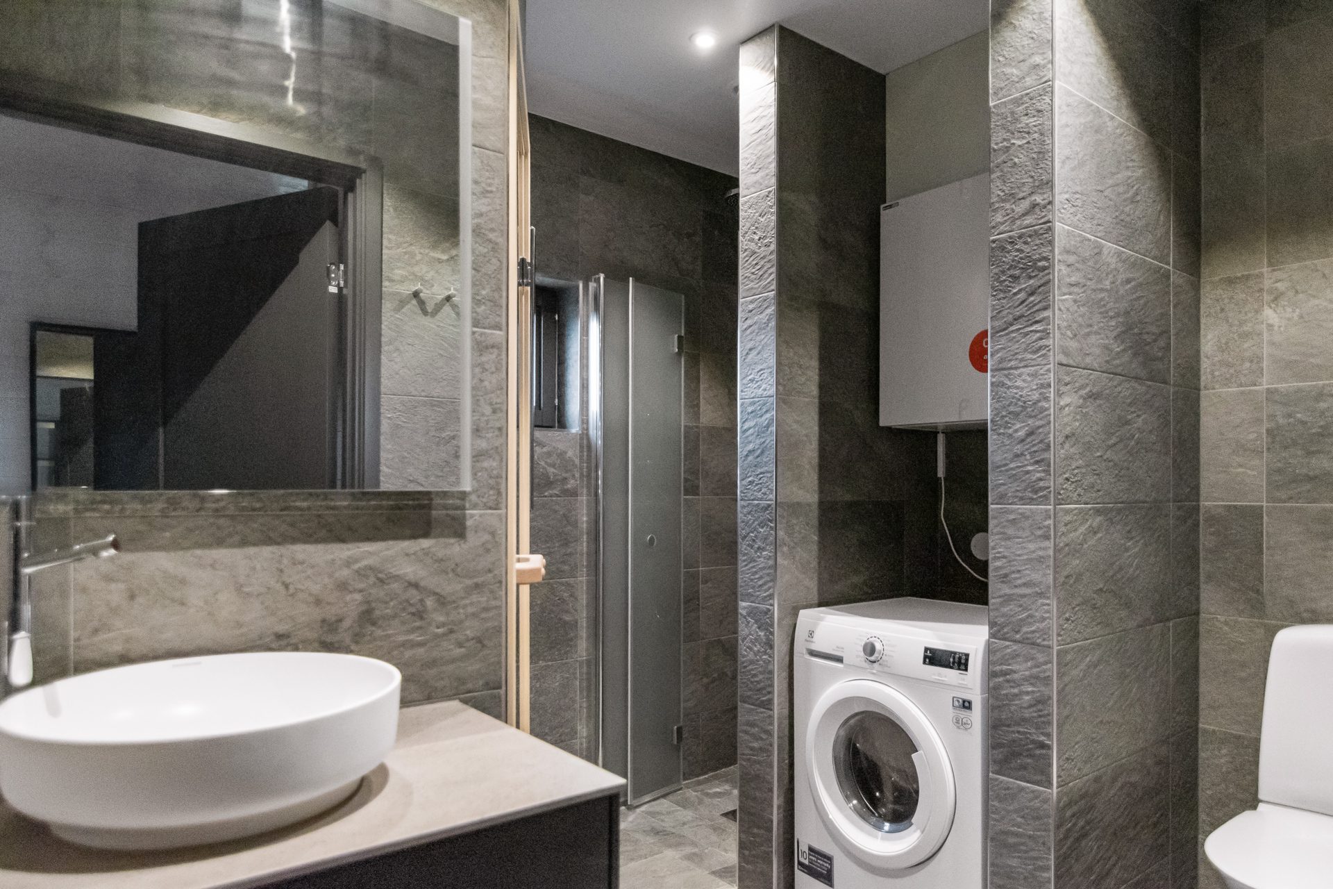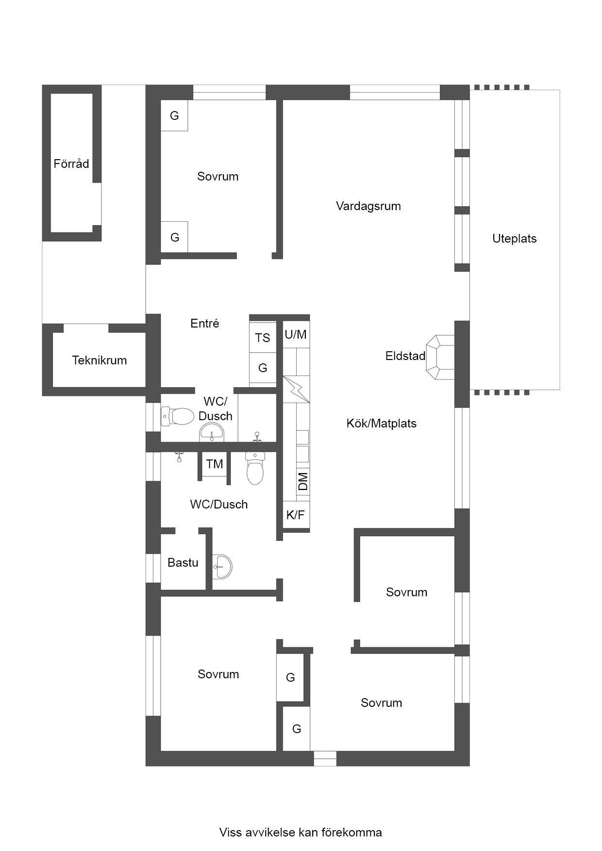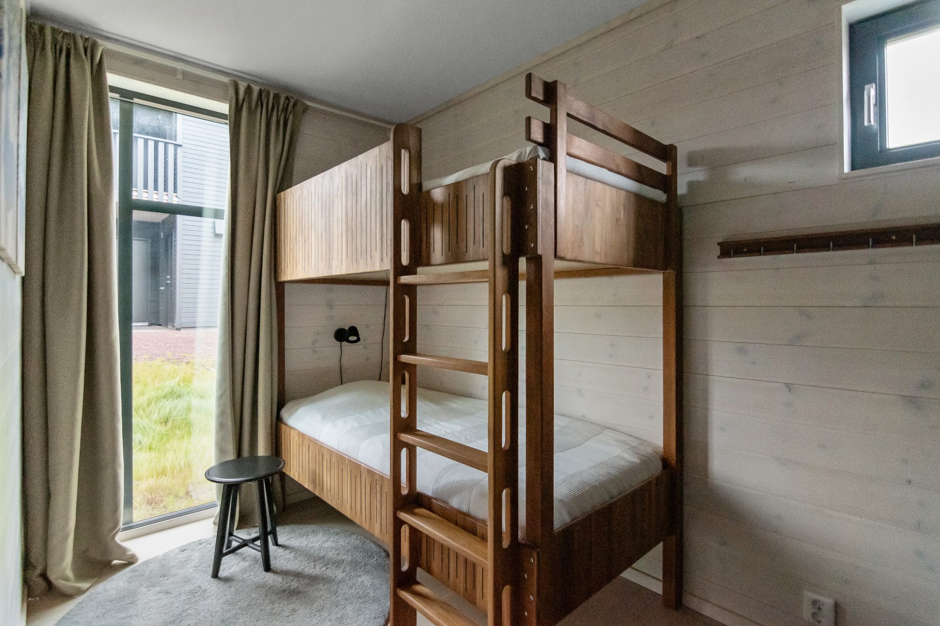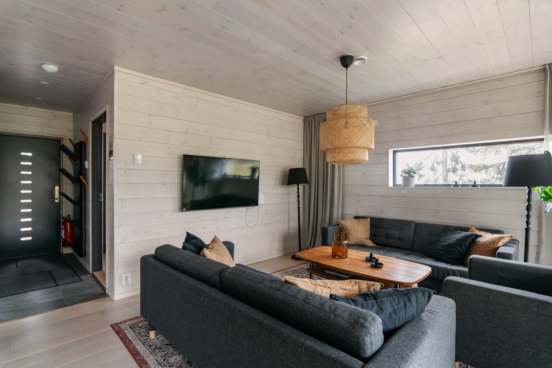 Invid hallen ligger ett badrum med dusch, wc och tvättställ. Sovrum till höger i hallen med dubbelsäng (160 cm) och ett högt fönster med ljusläpp. Hallen angränsar till vardagsrummet med plats för soffgrupp och utgång till uteplatsen. Öppen planlösning mellan vardagsrummet och köket som delas av med en stoltserande öppen spis. Köket är fullt utrustat med bra arbetsytor och matplats för 8-10 personer. Köket innehåller hällspis med ugn, kylskåp, frys, diskmaskin, mikrovågsugn och vinkyl. Längst in i lägenheten hittar vi ett badrum med bastu, dusch, wc och tvättmaskin samt tre ytterligare sovrum. Två av sovrummen har enkla våningssängar (90cm över och under). Det fjärde sovrummet är utrustat med en dubbelsäng (160cm).