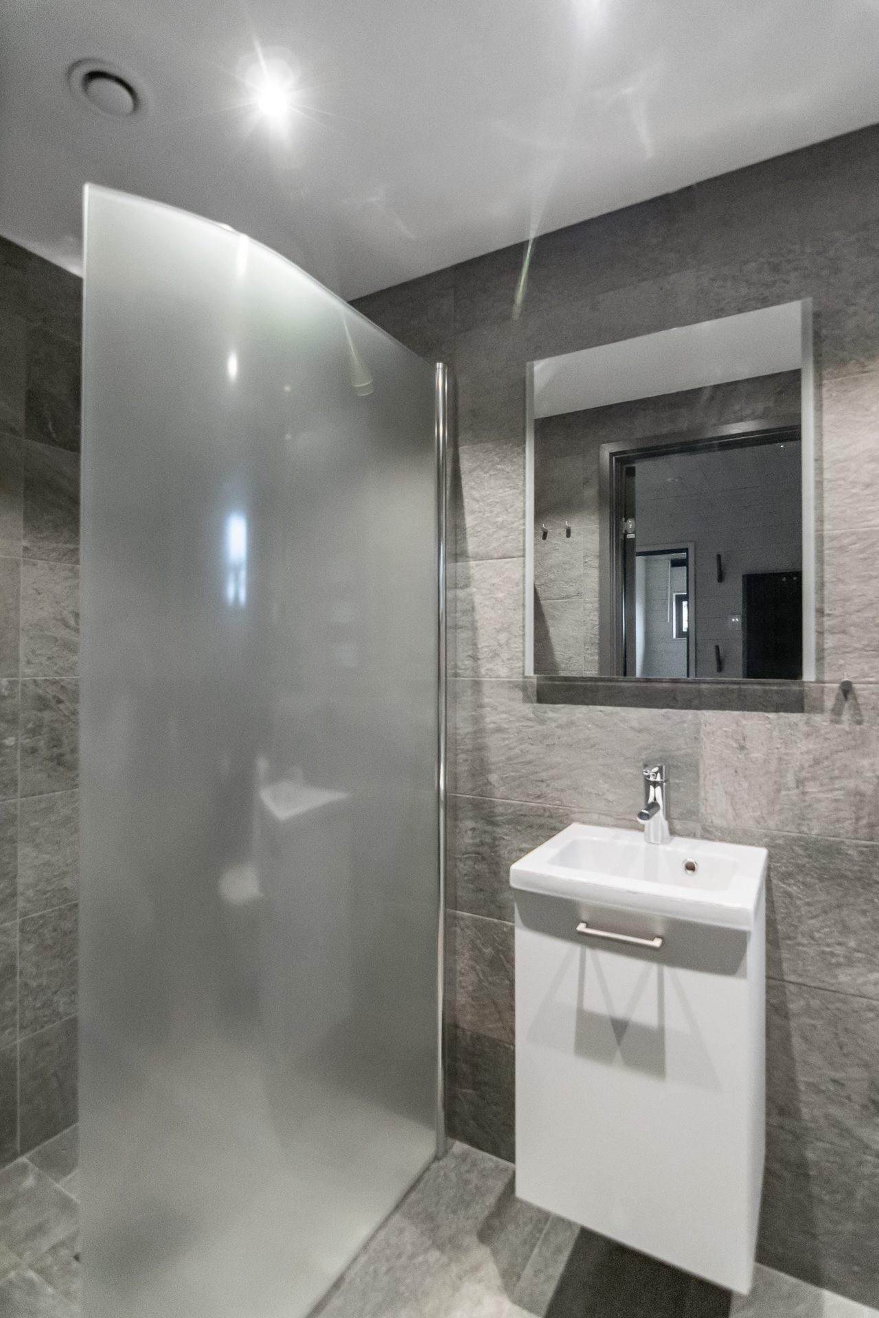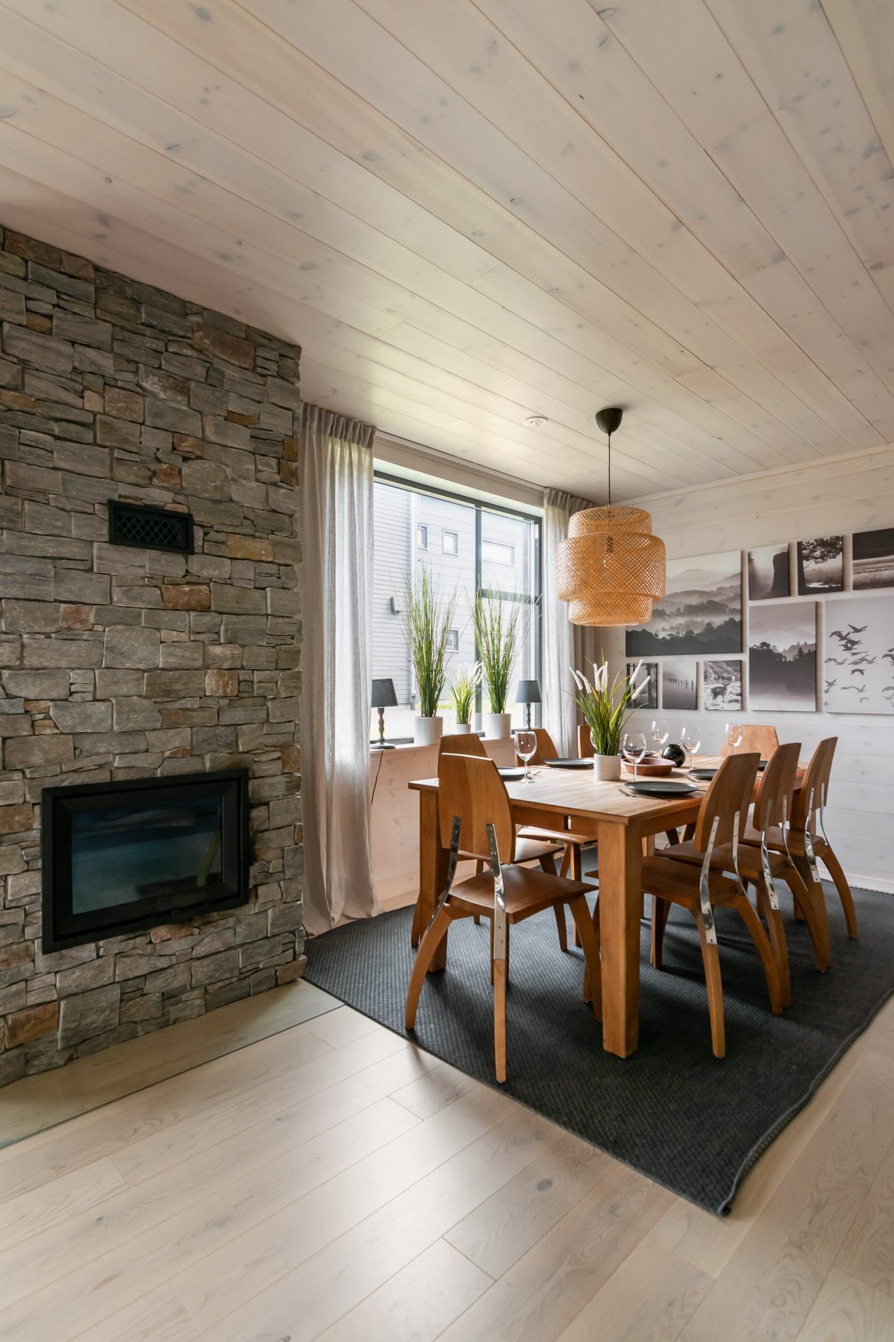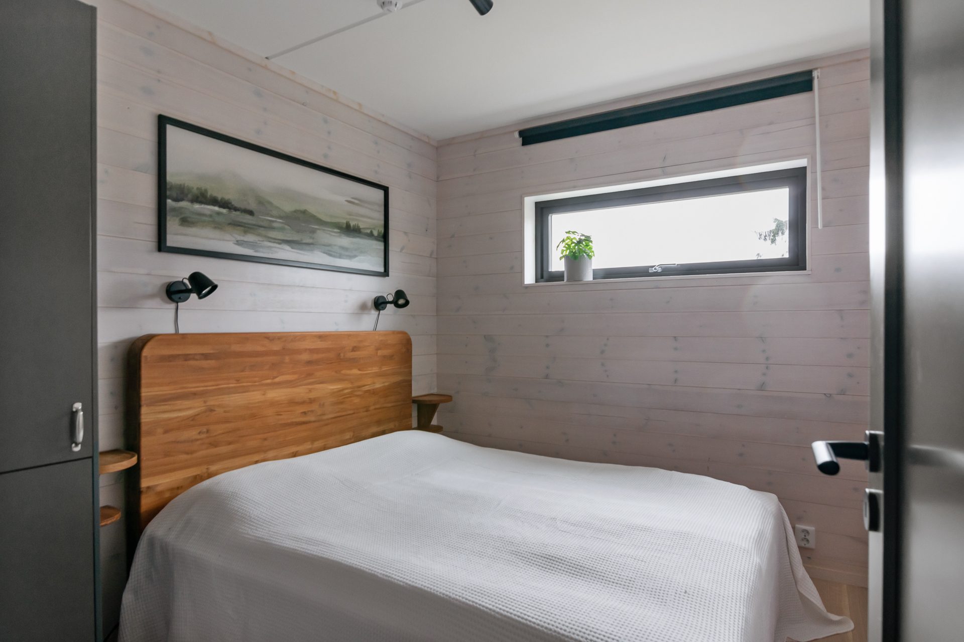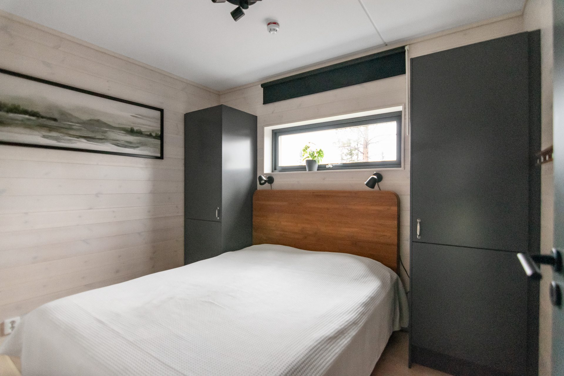 Invid hallen ligger ett badrum med dusch, wc och tvättställ. Sovrum till höger i hallen med dubbelsäng (160 cm) och ett högt fönster med ljusläpp. Hallen angränsar till vardagsrummet med plats för soffgrupp och utgång till uteplatsen. Öppen planlösning mellan vardagsrummet och köket som delas av med en stoltserande öppen spis. Köket är fullt utrustat med bra arbetsytor och matplats för 8-10 personer. Köket innehåller hällspis med ugn, kylskåp, frys, diskmaskin, mikrovågsugn och vinkyl. Längst in i lägenheten hittar vi ett badrum med bastu, dusch, wc och tvättmaskin samt tre ytterligare sovrum. Två av sovrummen har enkla våningssängar (90cm över och under). Det fjärde sovrummet är utrustat med en dubbelsäng (160cm).