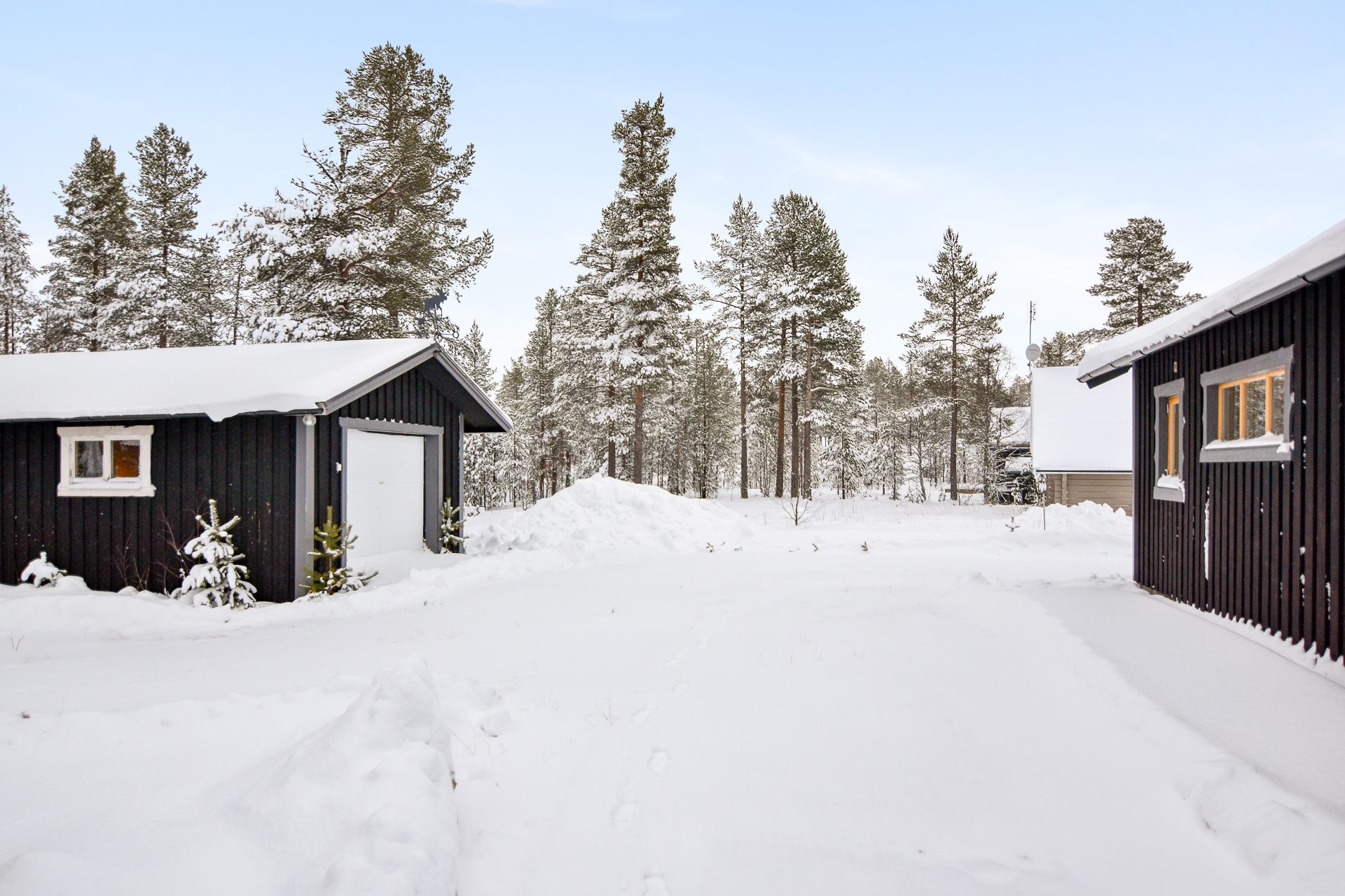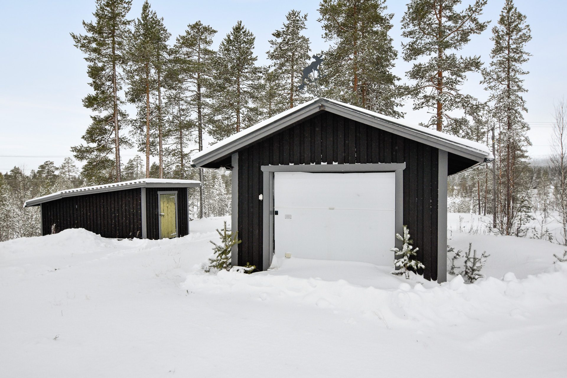 Huset med dess sidobyggnader upplevs praktiskt. Här finns skidförråd invid entrén. Garage med bra utrymme för skidvård, skoter, spark och cyklar för den aktiva familjen.