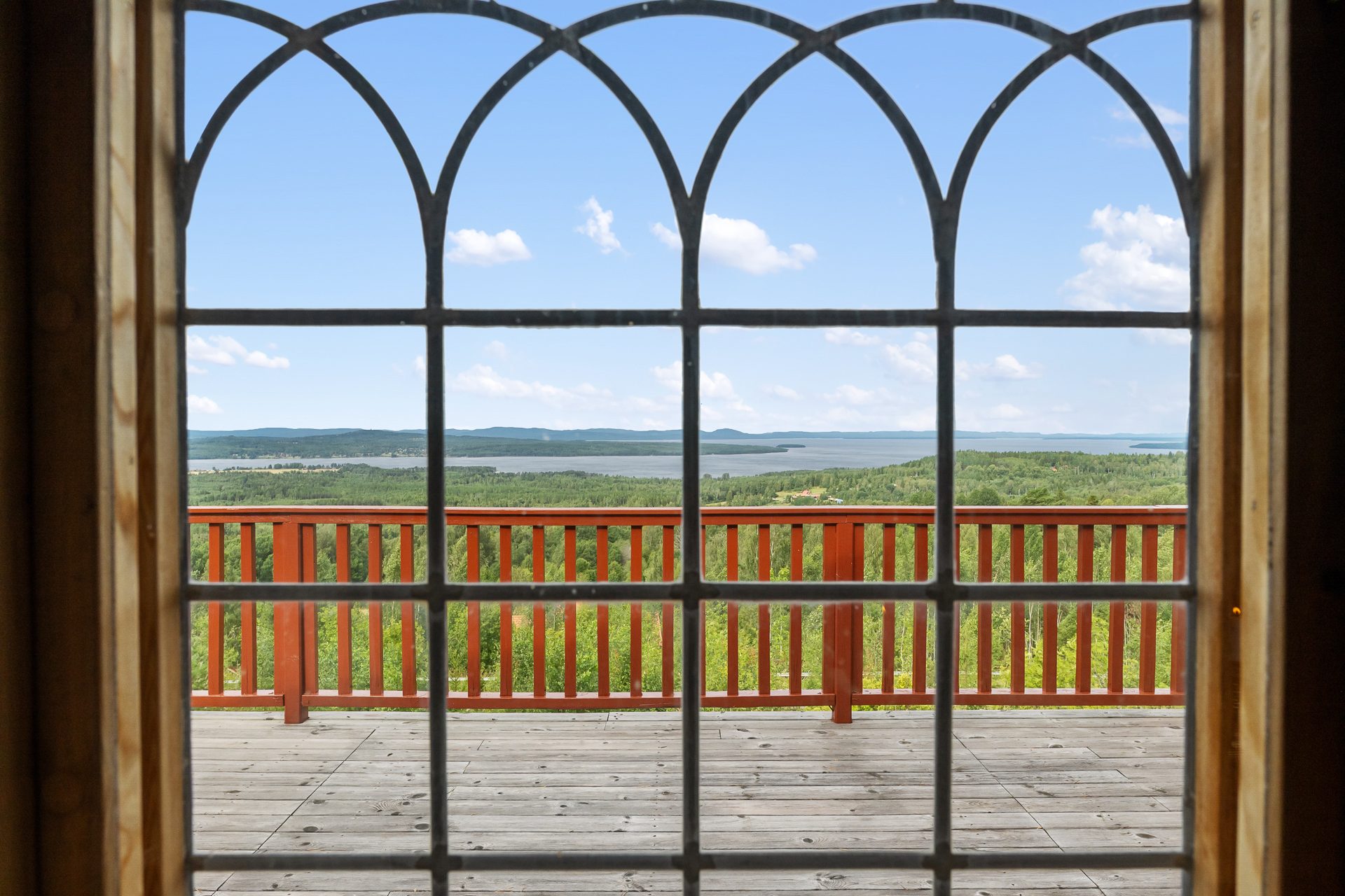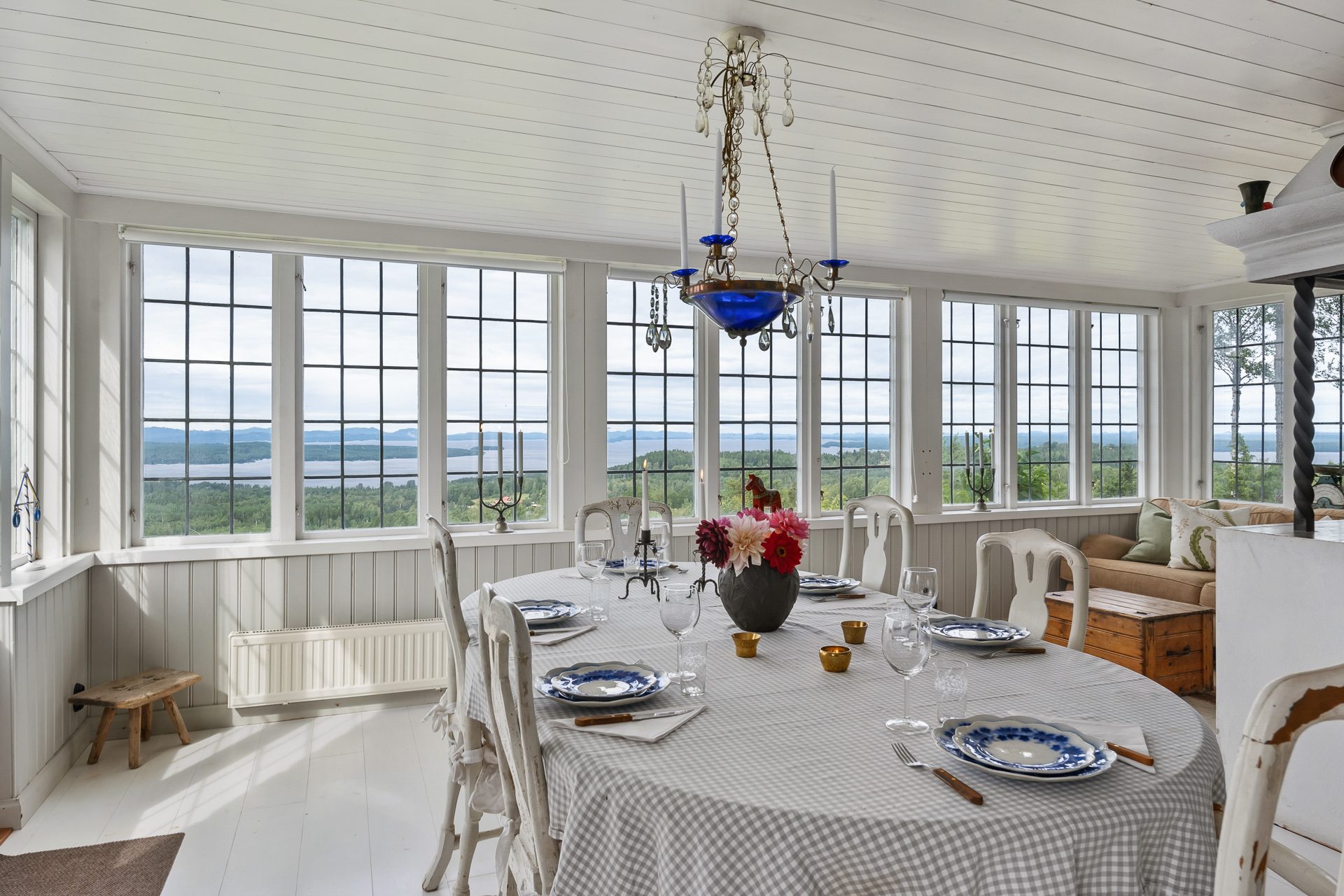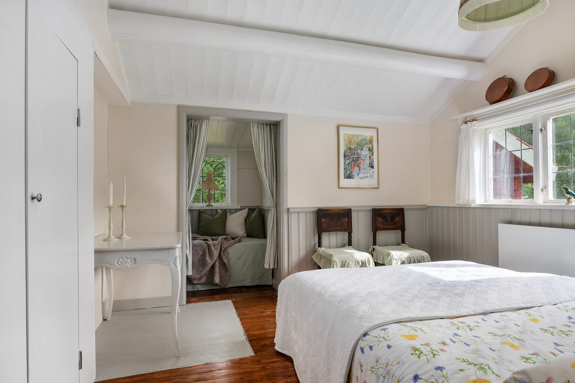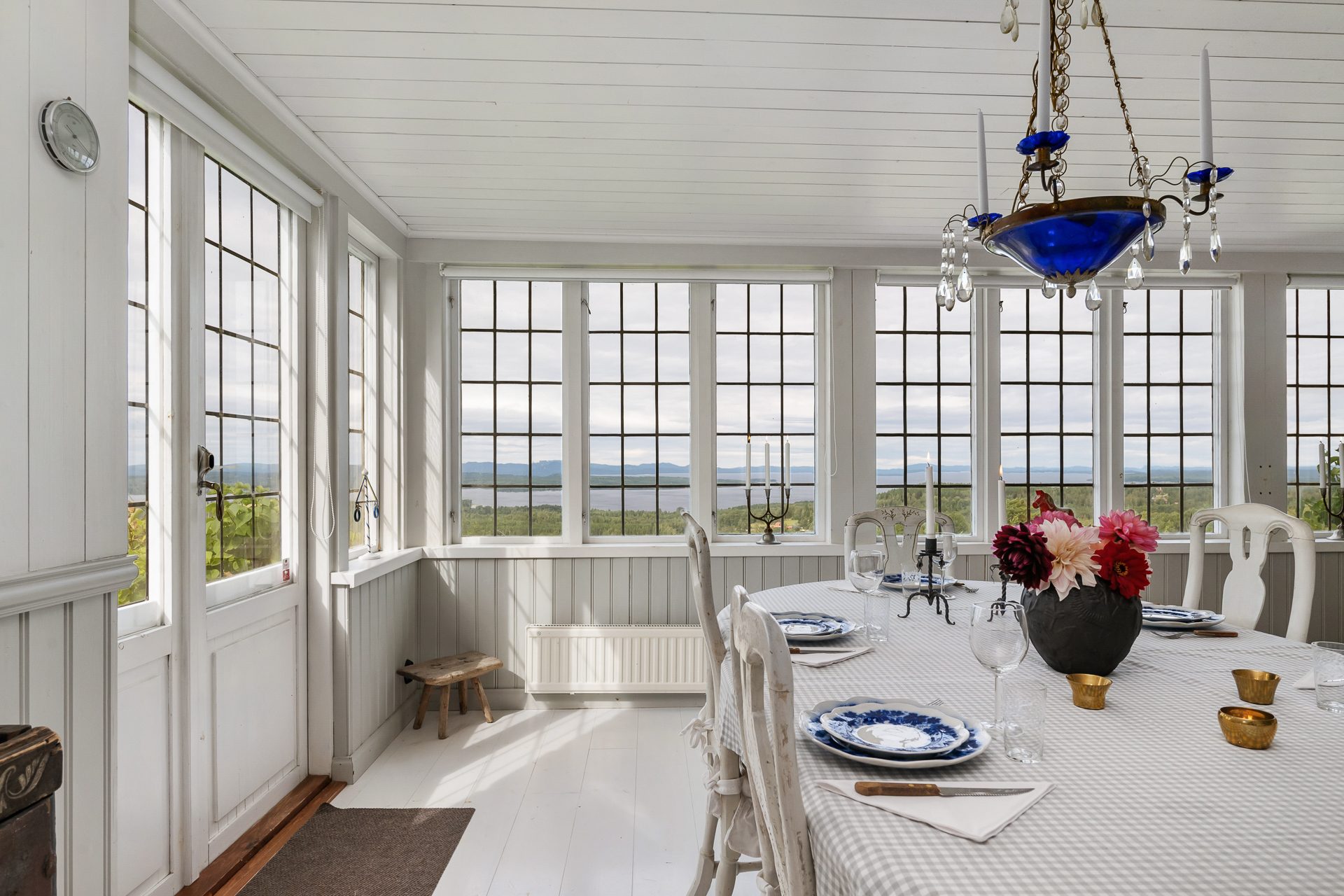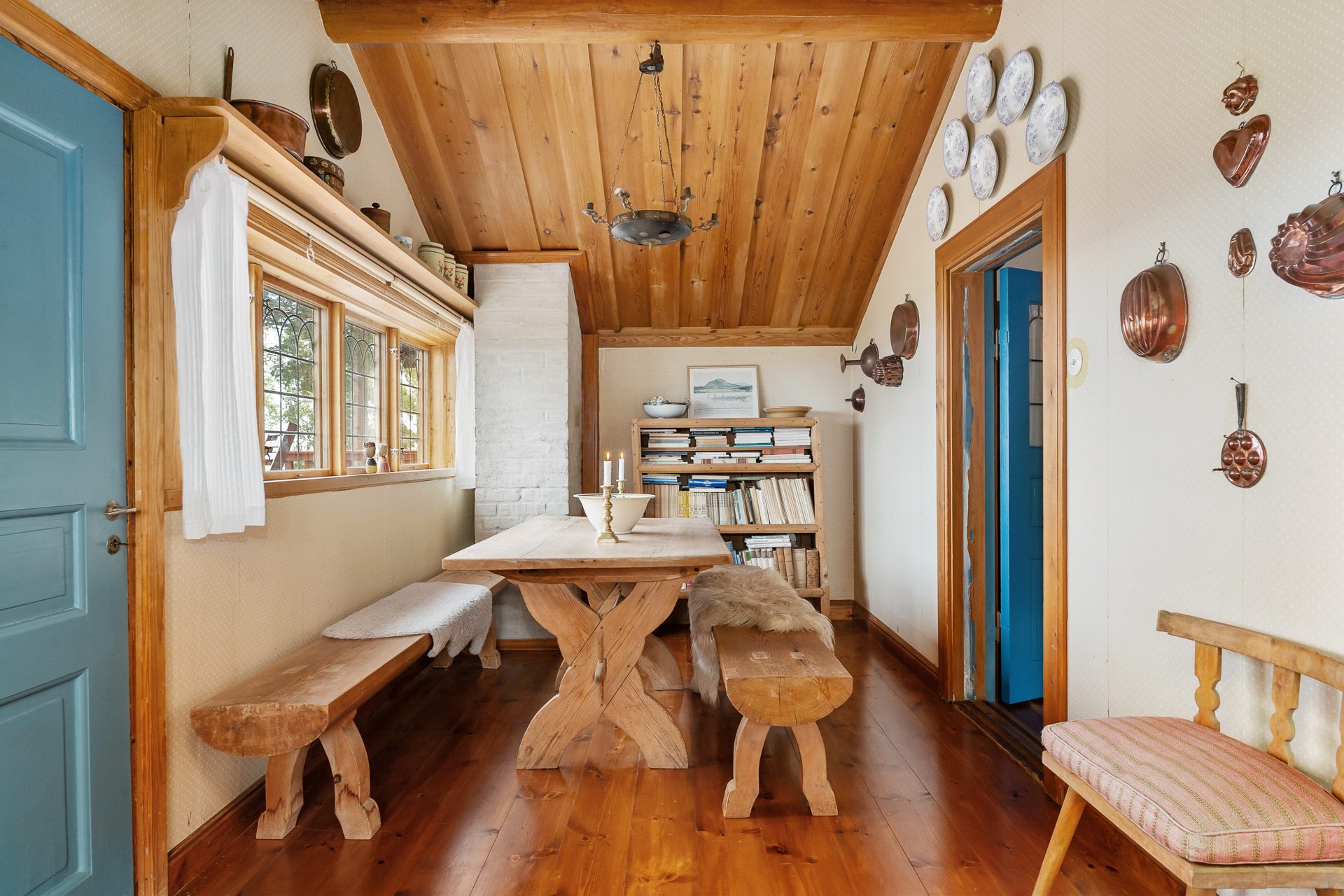Med en trappa ifrån hallen kommer man upp till det övre våningsplanet med matplats rakt ovanför köket. Här tar man lämpligen med sig kaffekoppen upp och slår sig ner. Från matrummet är det utgång till den generösa takterrassen med milsvid utsikt. Ytterligare ett sovrum med platsbyggd garderob och öppen spis.