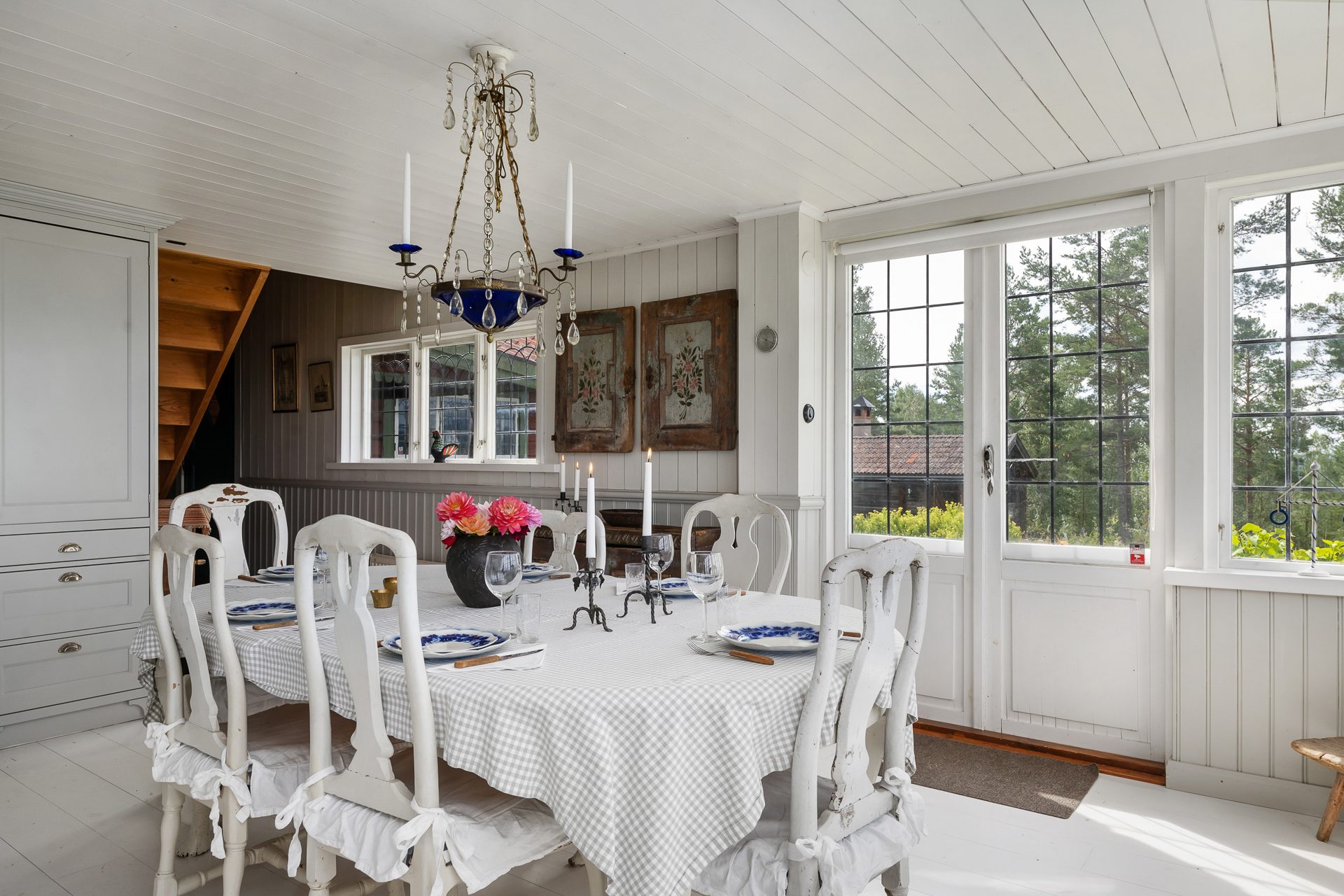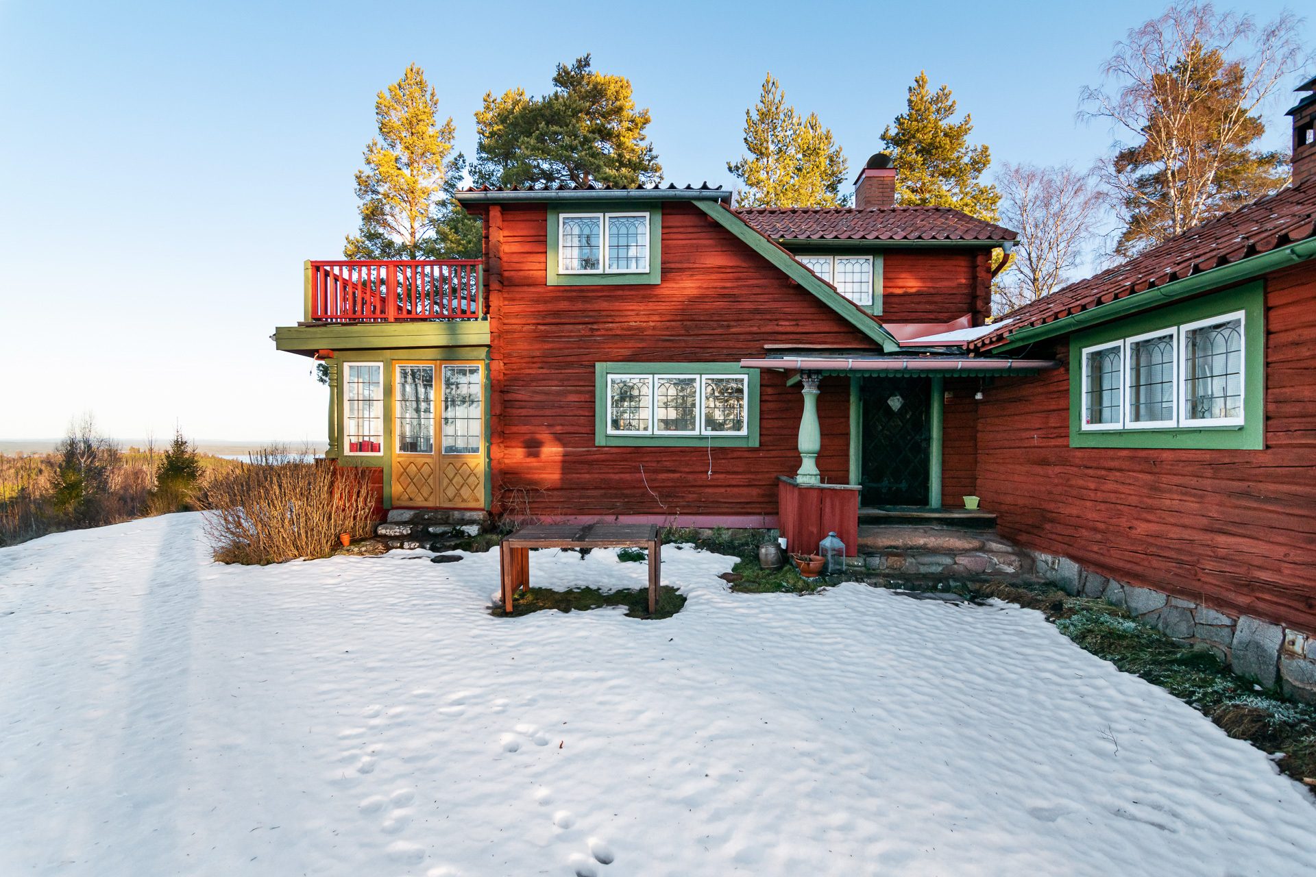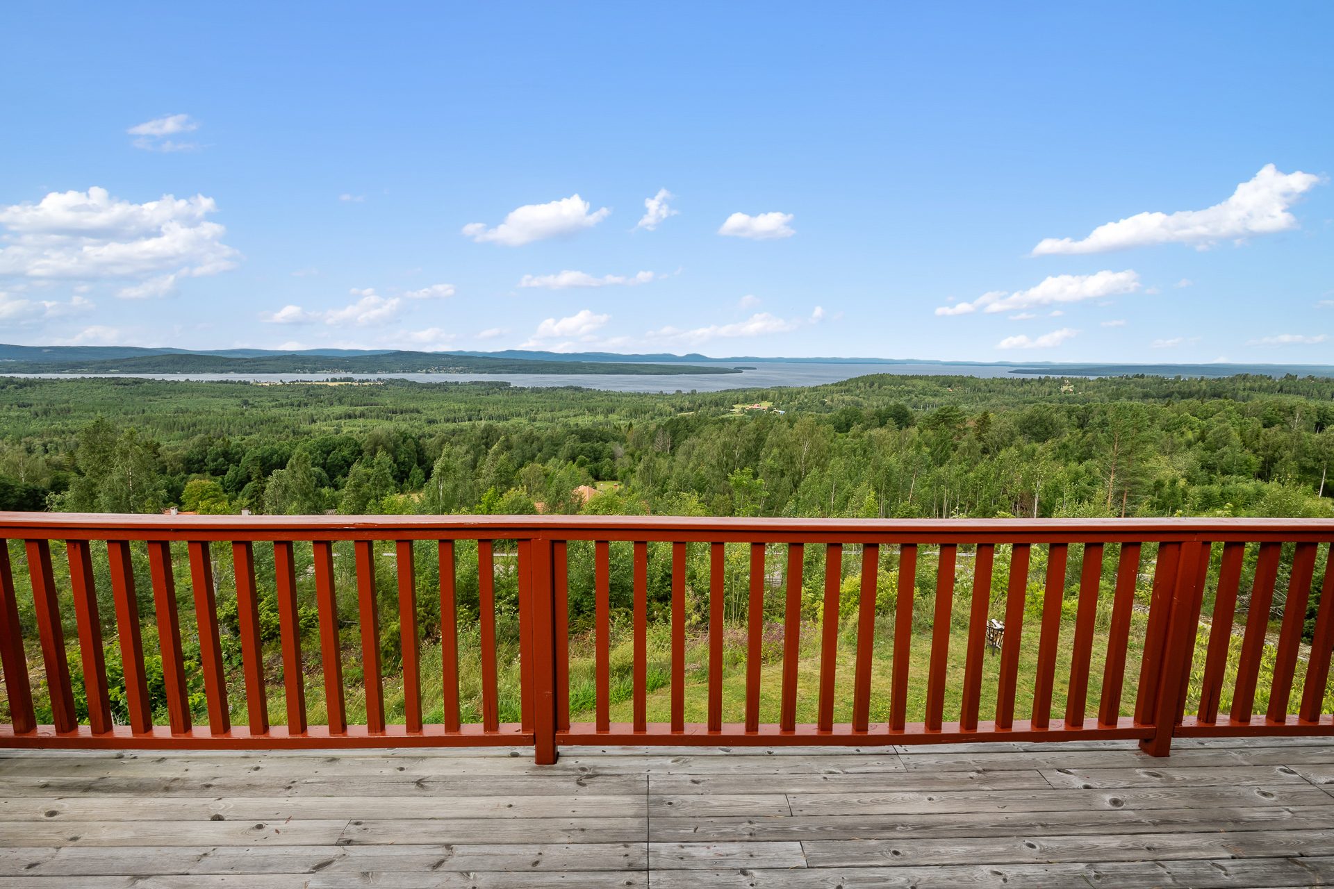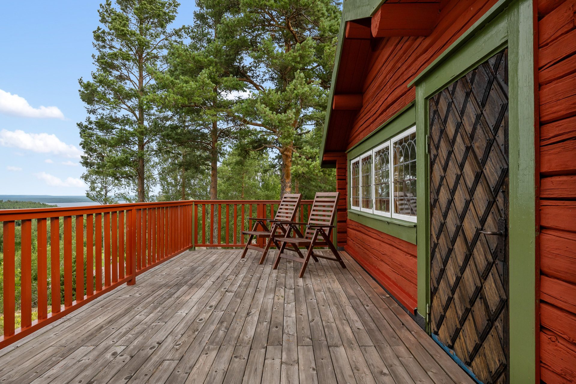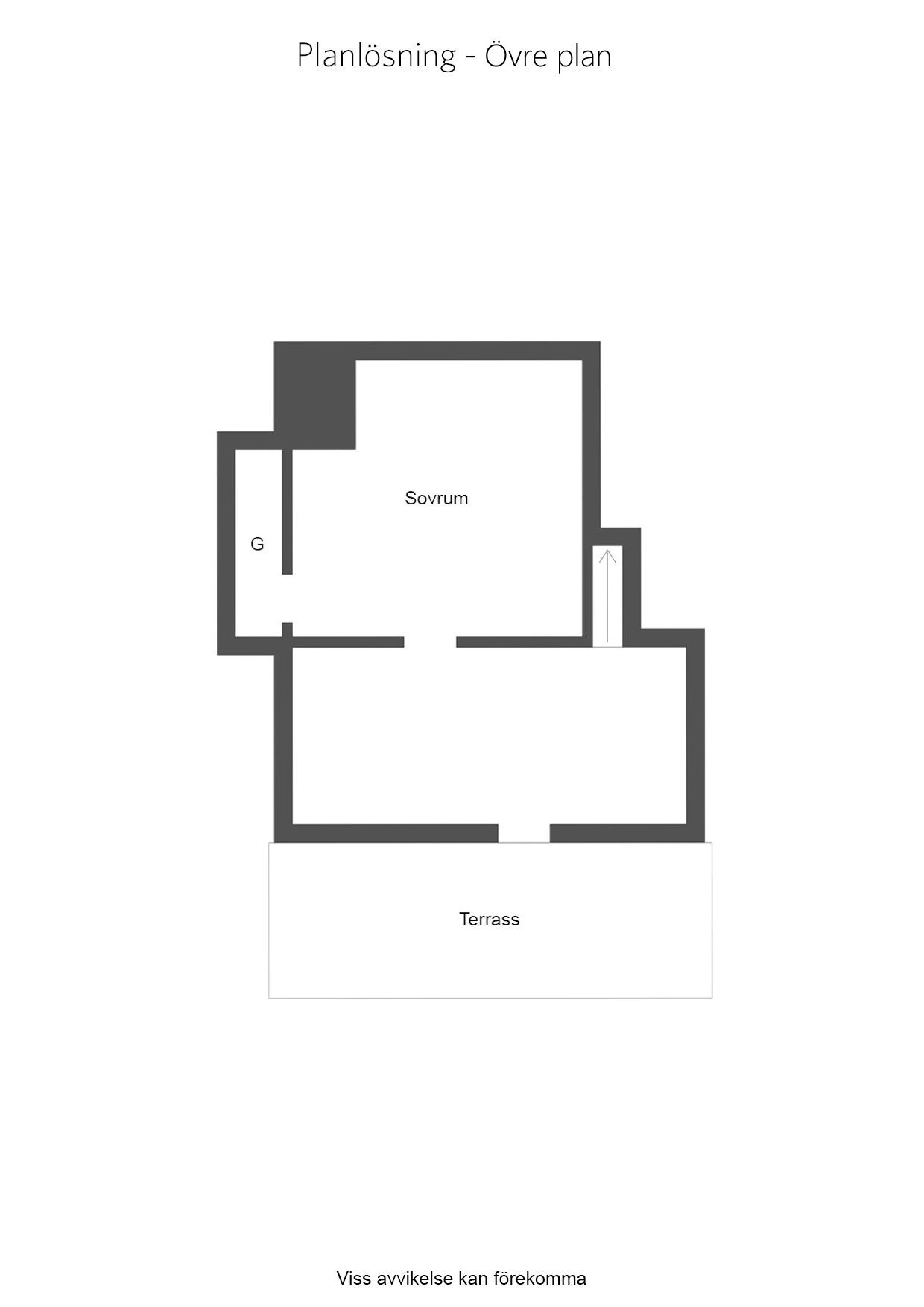 Med en trappa ifrån hallen kommer man upp till det övre våningsplanet med matplats rakt ovanför köket. Här tar man lämpligen med sig kaffekoppen upp och slår sig ner. Från matrummet är det utgång till den generösa takterrassen med milsvid utsikt. Ytterligare ett sovrum med platsbyggd garderob och öppen spis.