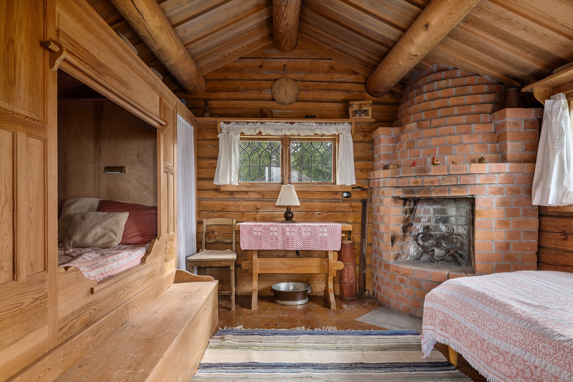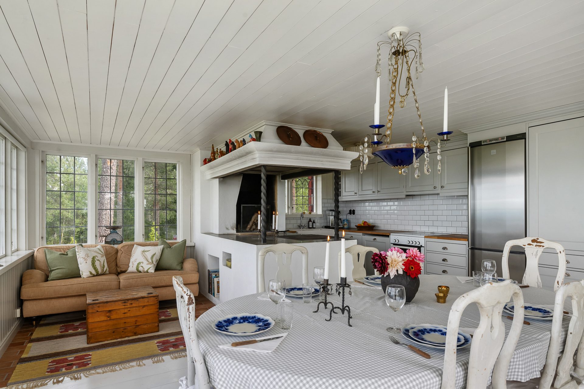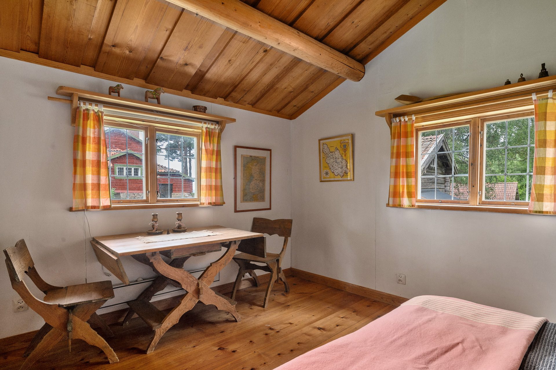 Välkomnande hall vid entrén som öppnar upp till bostadens samtliga rum. Smakfullt och lantligt kök med full maskinell utrustning. Här har det inte sparats på detaljerna med genomgående fina materialval så som bänkskiva i ek, genuina kökssnickerier från snickeri, vedspis och murad öppen spis. Vidare har köket öppen planlösning mot matsalen med vackert spröjsade fönster och vidsträckt utsikt över Siljan. Matplatsen har utrymme för 8-10 personer runt bordet samt pardörrar ut mot trädgården. Invid köket ligger masterbedroom med kamin, synliga takbjälkar och platsbyggd garderob. I fil med masterbedroom finner vi det andra sovrummet med sovalkov samt fönster mot gårdstunet. Längst in i hallen mellan sovrummet och storstugan ligger badrummet med dusch, wc, tvättställ och tvättmaskin. Husets största sociala yta är synnerligen storstugan. Här samsas platsbyggda sängar med vardagsrumsmöblemanget tillsammans med en vacker öppen spis.