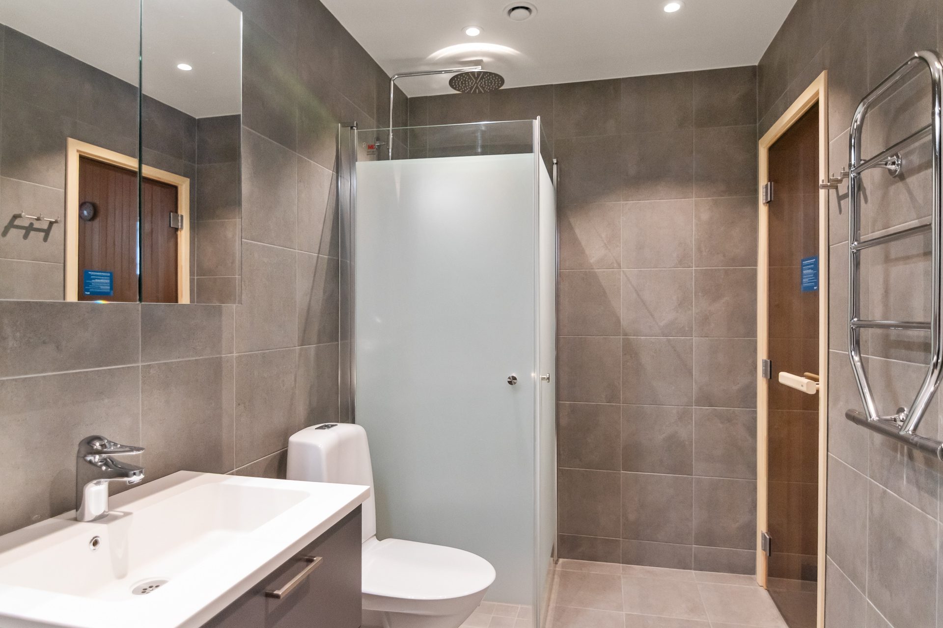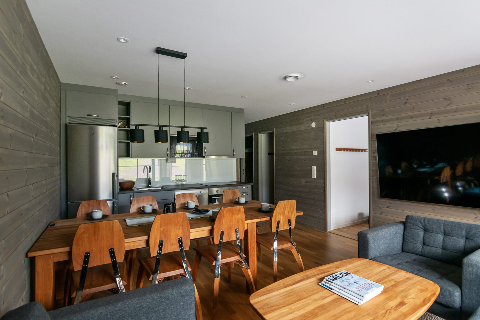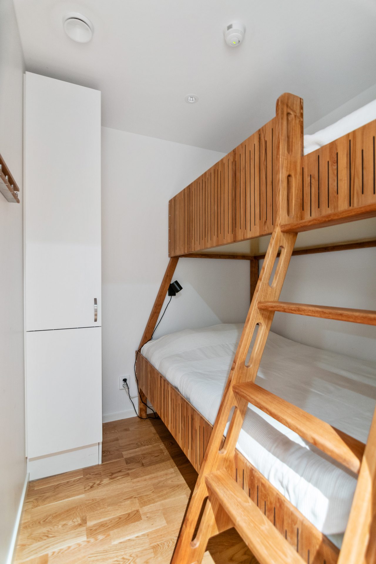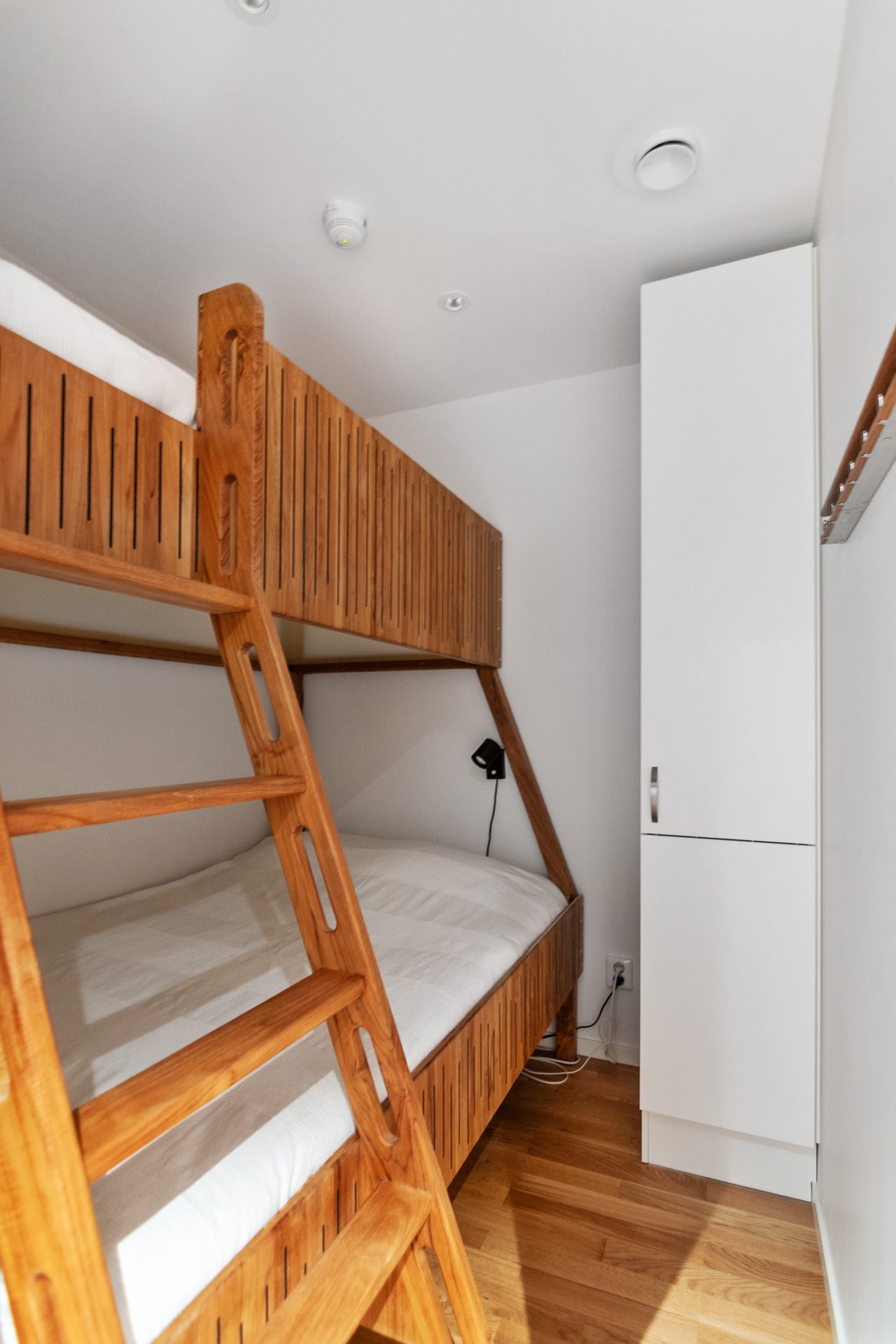 - Allmän beskrivning: Rymlig hall med stort avhängningsrum utrustat med torkskåp. Två helkaklade badrum med dusch, wc och tvättställ. Ett av badrummen har även inbyggd bastu. Vidare finns det tre sovrum varav ett masterbedroom med dubbelsäng samt två sovrum med våningssängar. Köket har full maskinell utrustning och matplats för 8-10 personer. Öppen planlösning mot vardagsrummet med stora fönsterpartier mott innergården och utgång till en trädäckad uteplats.