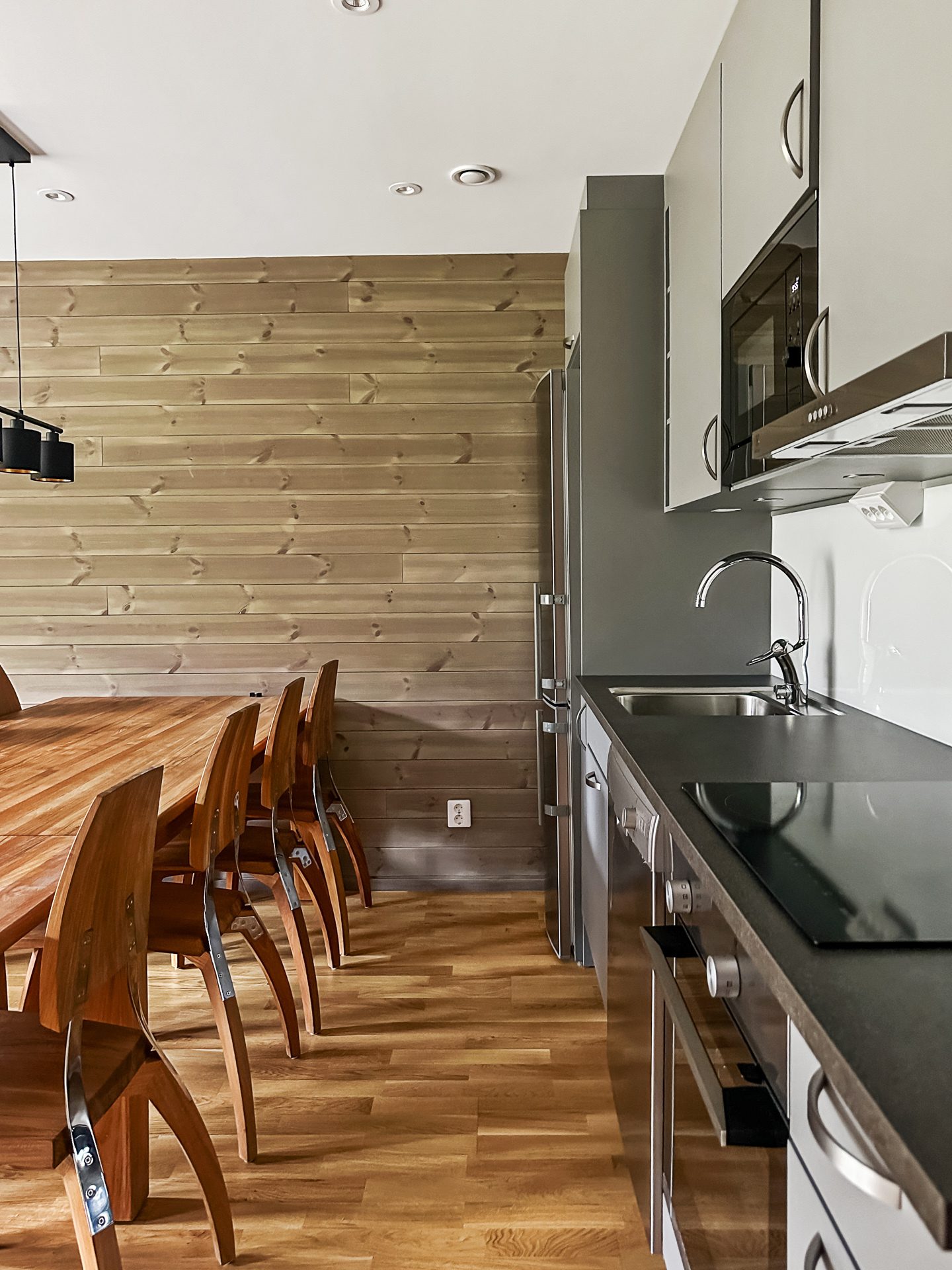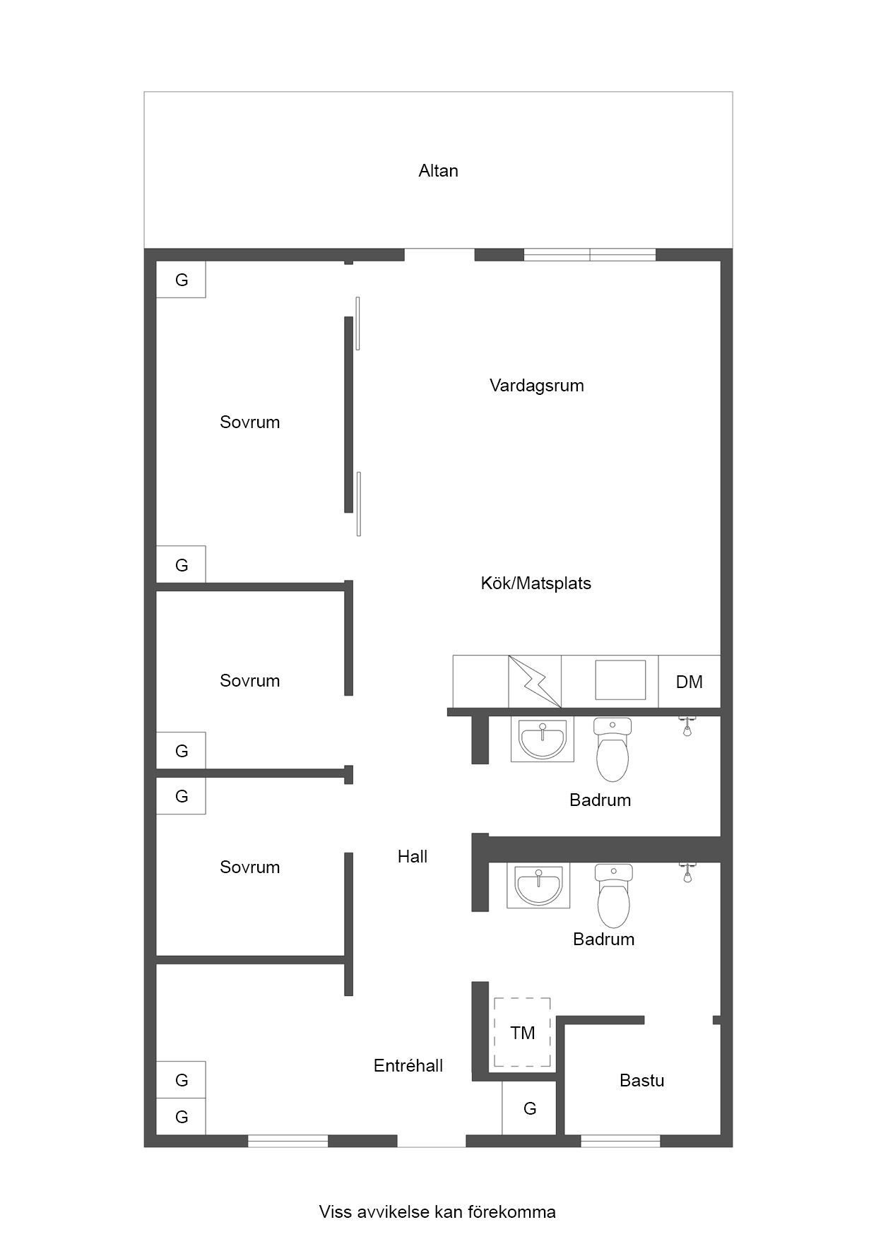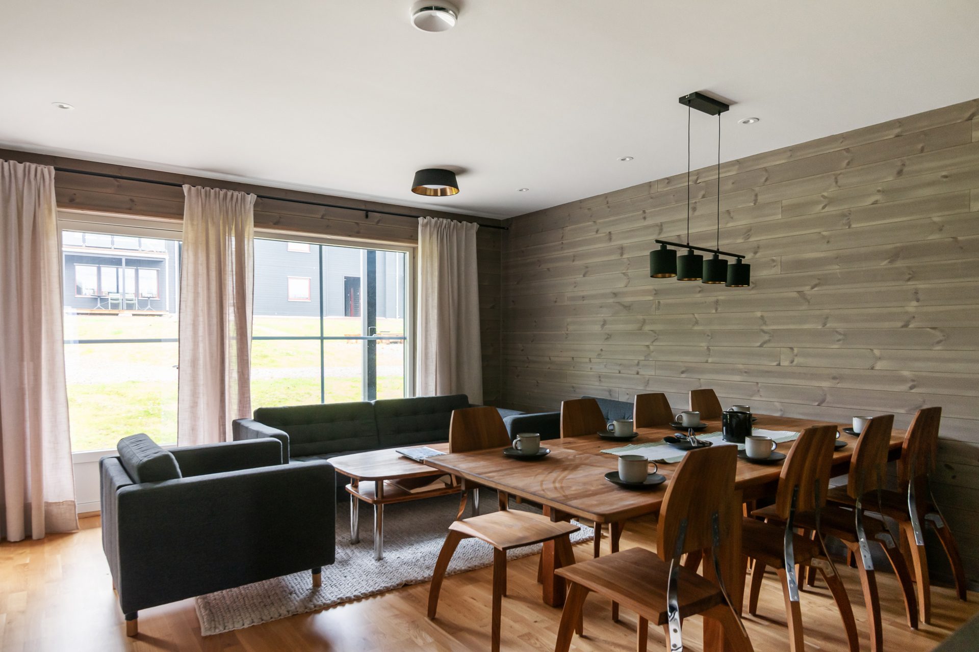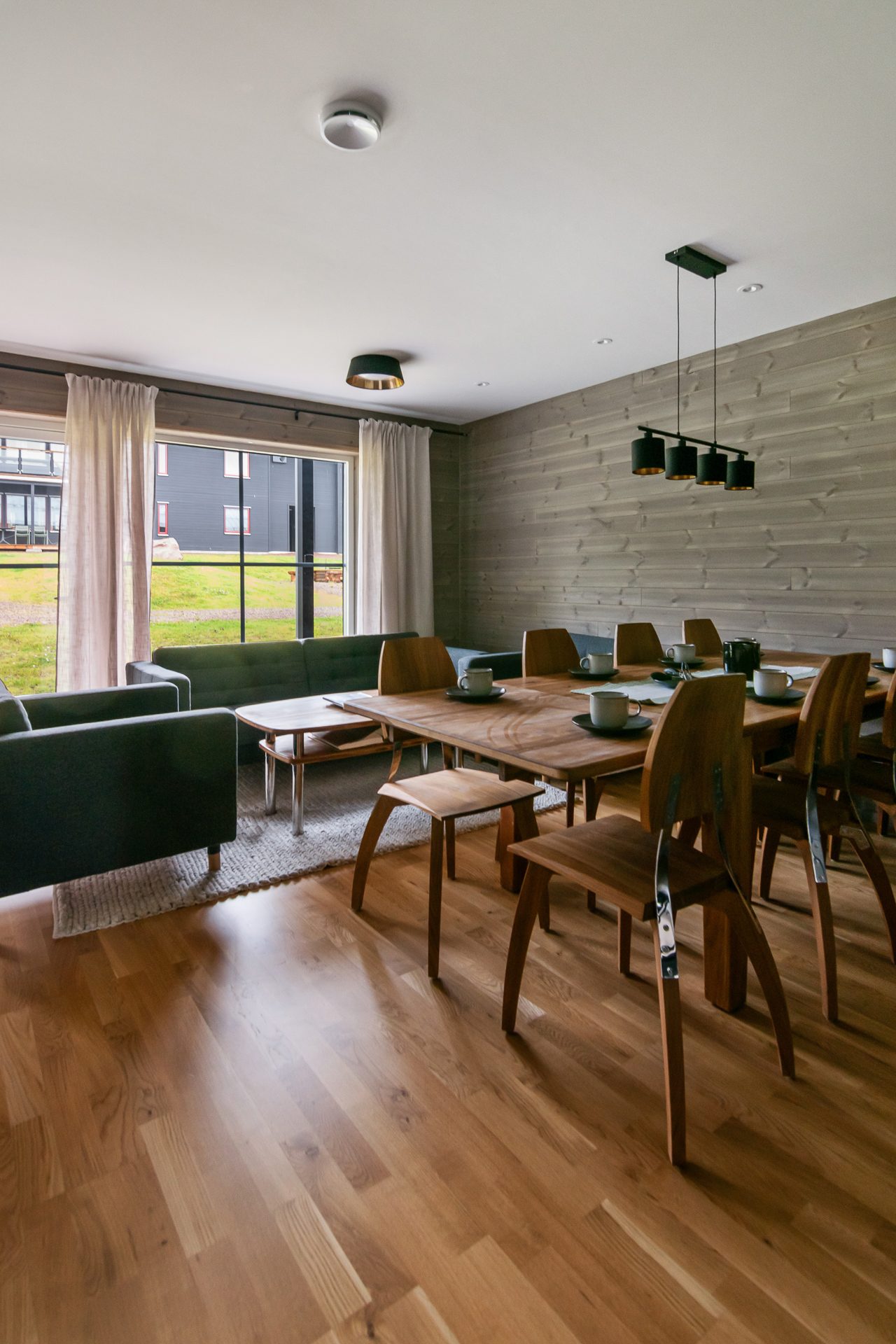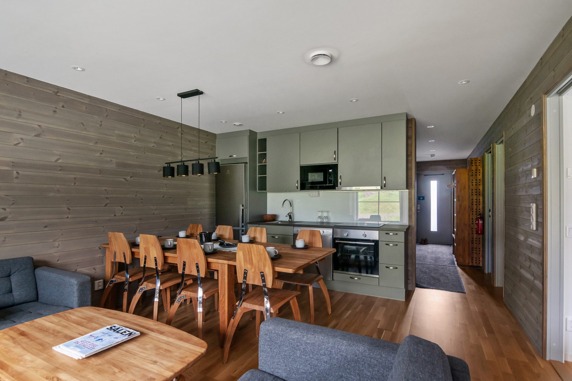 - Allmän beskrivning: Rymlig hall med stort avhängningsrum utrustat med torkskåp. Två helkaklade badrum med dusch, wc och tvättställ. Ett av badrummen har även inbyggd bastu. Vidare finns det tre sovrum varav ett masterbedroom med dubbelsäng samt två sovrum med våningssängar. Köket har full maskinell utrustning och matplats för 8-10 personer. Öppen planlösning mot vardagsrummet med stora fönsterpartier mott innergården och utgång till en trädäckad uteplats.